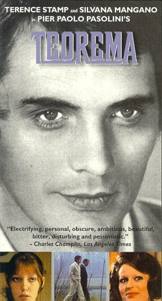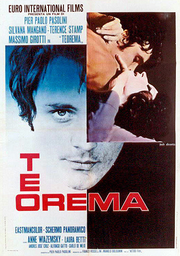 <테오레마>에서 테렌스 스탬프는 부유한 이탈리아 가정에 머물면서 가족들을 차례로 유혹하는 역을 맡는다. 그가 하인과 아들, 어머니와 딸, 그리고 마지막으로 아버지와 성관계를 갖고 떠나자 이들은 모두 서서히 자기 파괴의 길로 들어선다. 다양한 현상을 주재하는 추상적 법칙이라는 뜻의 영화 제목 <테오레마>는 바로 이 신비한 손님을 가리키며, 다섯 가족의 운명은 바로 그의 손에서 결정된다.