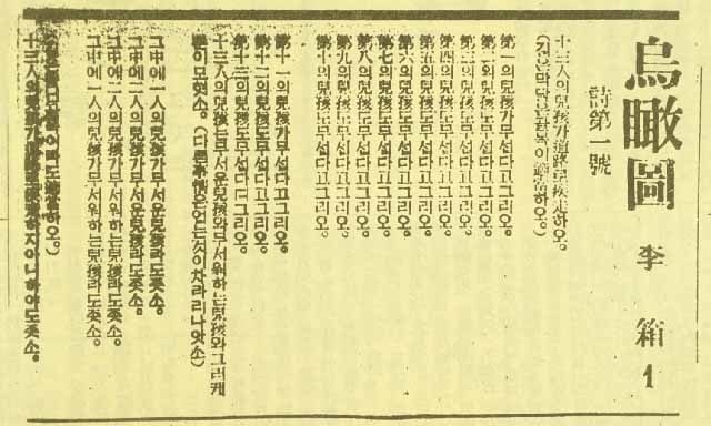 이상의「오감도」는 처음부터 말썽이었어. 원고가 공장으로 내려가자 문선부에서 ‘오감도(烏瞰圖)’가 ‘조감도(鳥瞰圖)’의 오자가 아니냐고 물어왔어. 오감도란 말은 사전에도 나오지 않고 듣도 보도 못한 글자라는 것이야. 겨우 설득해서 조판을 교정부로 넘겼더니, 또 거기서 문제가 생겼어. 나중에 편집국장에까지 진정이 들어갔지만 결국 시는 나갔어. 그다음부터 또 문제였어. “무슨 미친놈의 잠꼬대냐.”, “무슨 개수작이냐.”, “당장 신문사에 가서 오감도의 원고 뭉치를 불살라야 한다.”, “이상이란 작자를 죽여야 한다.”…… 신문사에 격렬한 독자 투고와 항의들이 빗발쳐 업무가 마비될 지경이었지.”