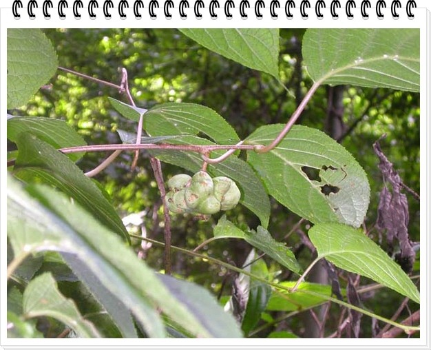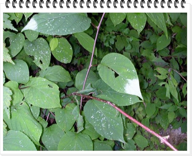 식물: 덩굴뻗고 잎지는 나무이다. 잎은 둥근 달걀 모양이고 밑이 둥글다. 여름철에 잎의 가운데에서부터 윗부분까지 흰색을 띤다. 이른 여름에 흰색 꽃이 핀다. 열매는 긴 타원형이다. 각지의 산골짜기에서 자란다.