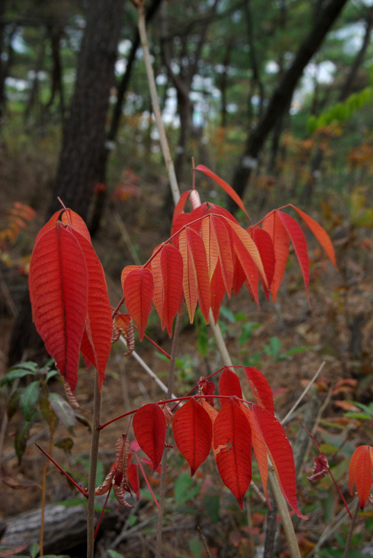 가을 야산 양지쪽에 새빨갛게 이글이글 타는 단풍은 거의 틀림없이 개옻나무거나 옻나무 친척인 붉나무, 그리고 화살나무다.