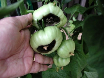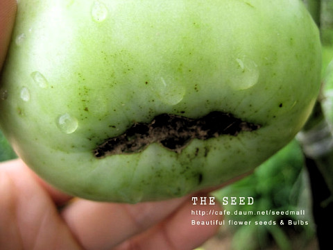 토마토 배꼽 썩음병에 걸린 열매는 꽃이 떨어진 배꼽 부분에 작은 갈색 점이 생기는데 열매가 커지면서 점점 면적이 넓어지고