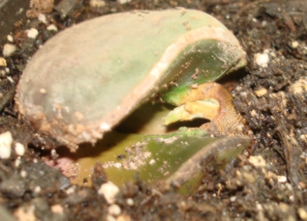 추가로 발아하고 있는 2녀석의 모습입니다. 떡잎이 나오기 위해 갈라진 씨앗틈으로 하얀 줄기 부분이 보이고 있고, 다른 하나는 갈라진 틈으로 줄기의 모습이 확연히 보입니다. 이 녀석이 일어서면서 위와 같이 자라납니다. 삼각대 세우고 후레쉬 저속동기로 찍었는데 초점이 살짝 어긋나네요.