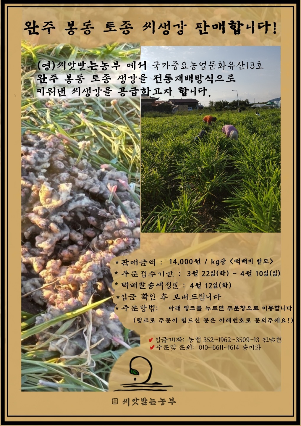 [씨앗받는 농부 영농법인에서 전통재배방식으로 키운 완주 봉동 토종씨생강 공급안내]