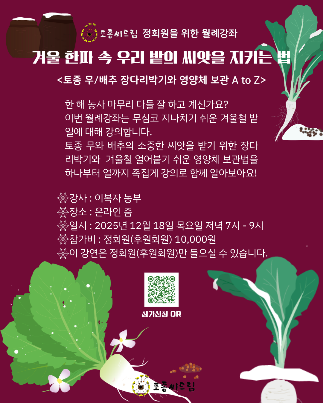 이번 월례강좌는 이복자 농부님을 모시고 무심코 지나치기 쉬운 겨울철 밭 일에 대해 알아보고자 합니다.