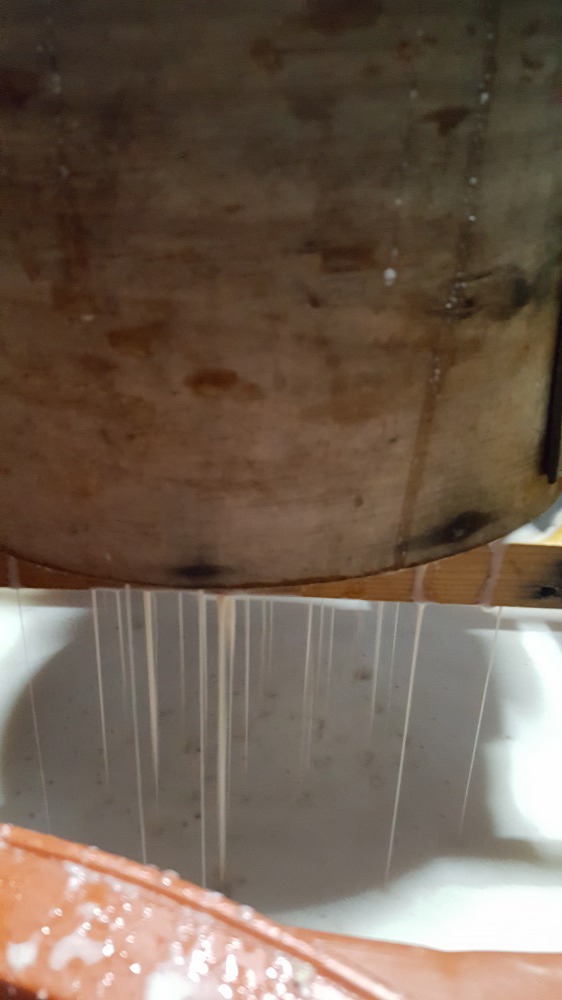 메밀가루는 점성이 높아서 주루룩 흐르듯하는데, 채에 처음 거른 메밀물을 넣고 손으로 계속 내려주어야 합니다.