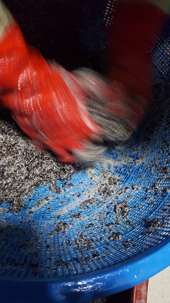 위 사진에다가 물을 둘러서 약간 자박하게 되면 그걸 이런 망태기나 양파망 같은데 넣어서 치대어 빨아 냅니다.