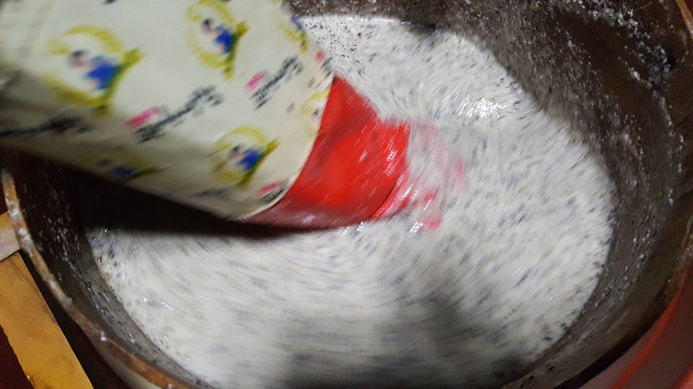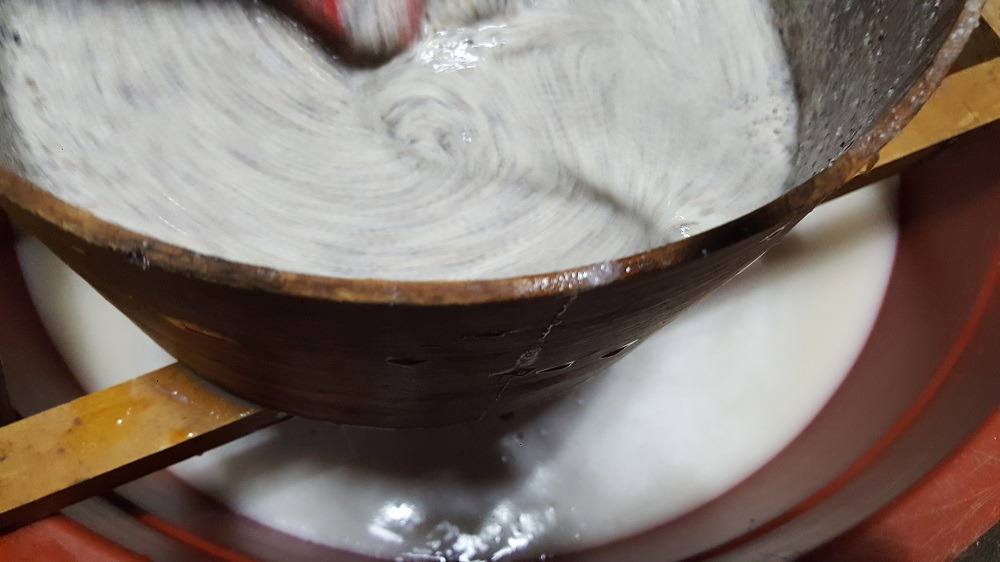 이렇게 두어번 내린 메밀물을 바로 끓이면서 저어 굳히면 묵이 되고,