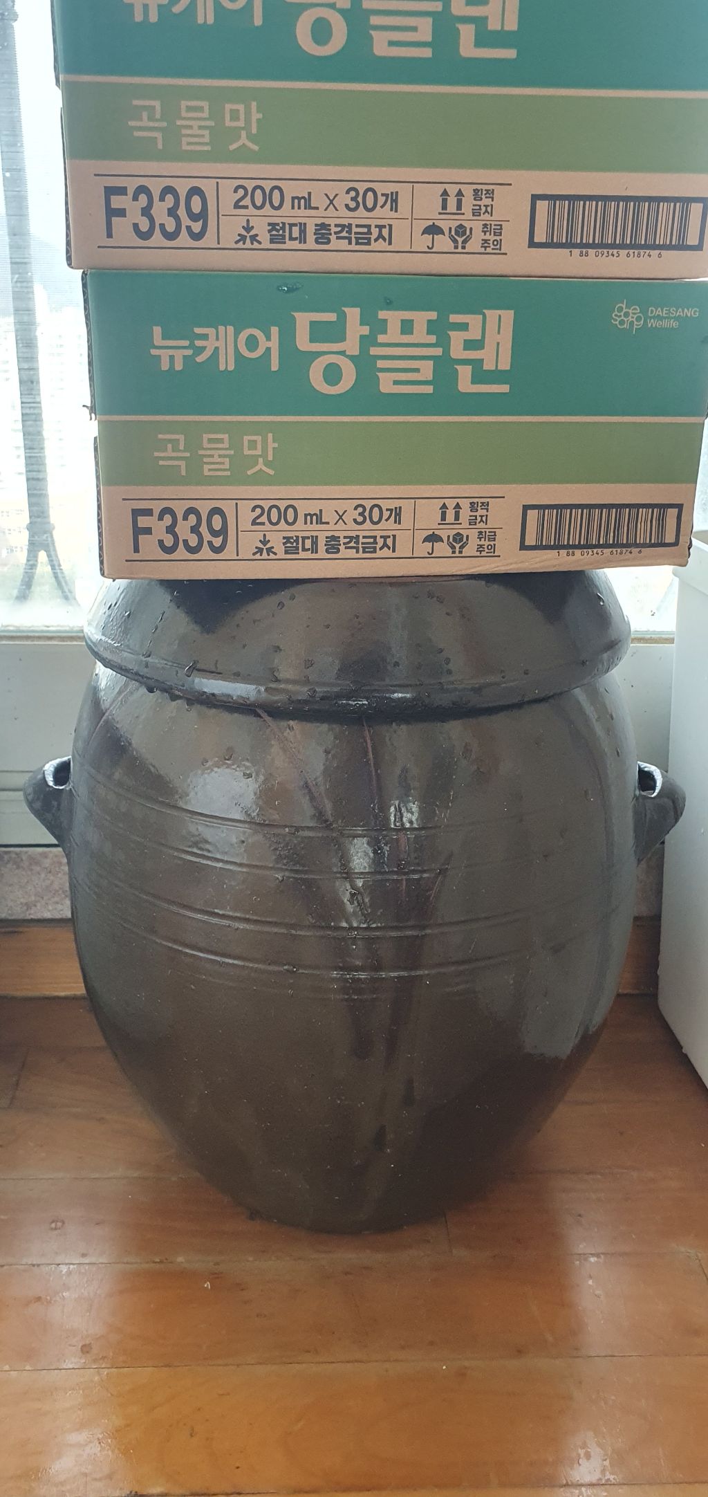 8. 항아리 뚜껑이 들 뜨도록 갓을 넣어서 무거운 것으로 눌러주었습니다. 항아리 위치는 아파트 현관입니다.
