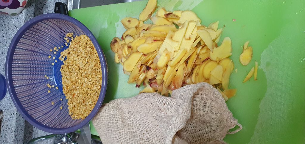 2. 생강을 편썰고, 고추씨앗도 세척 후 베보자기에 넣습니다.