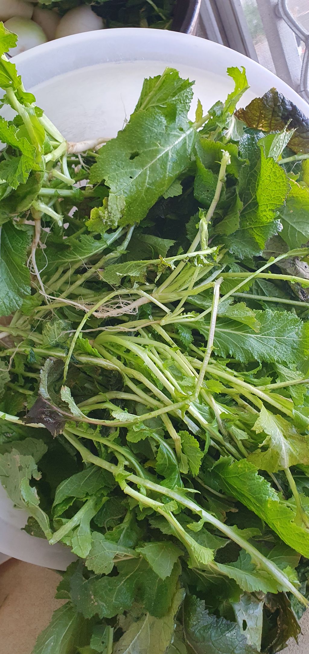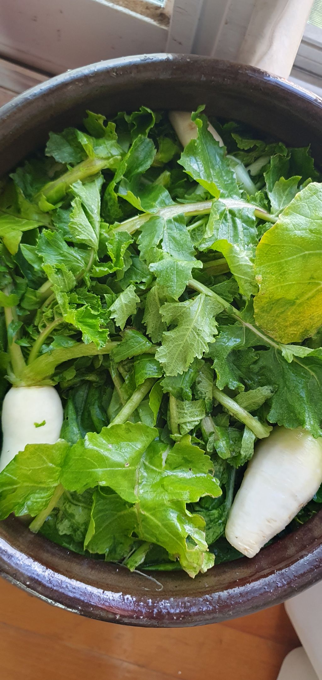 6. 무우 위로 뿌리를 살린 청갓과 적갓 그리고 작은 무가 달린 무청을 꾹꾹 눌러 덮었습니다.