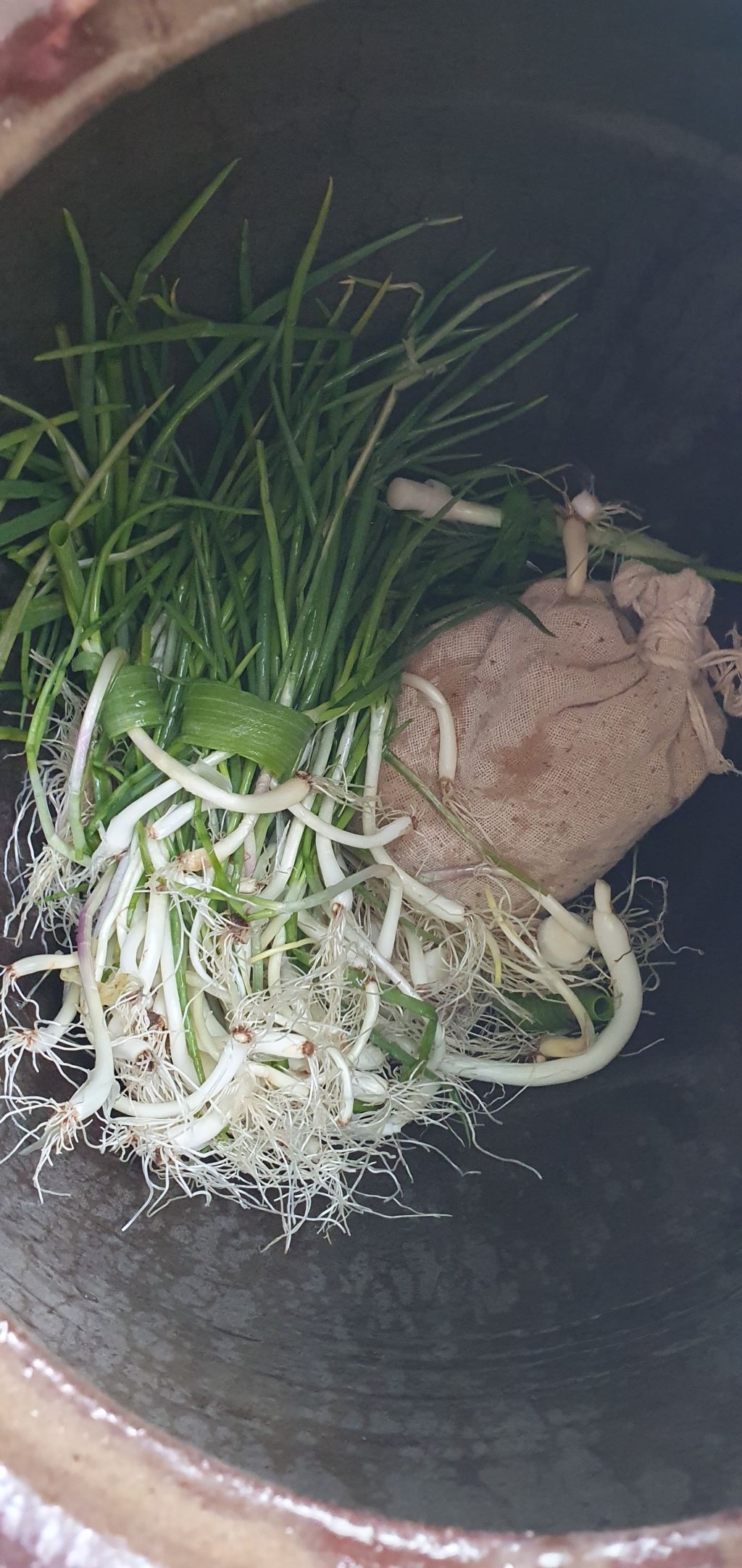 3. 뿌리를 살린 쪽파와 파뿌리 그리고 생강과 고추씨앗을 넣은 베보자기를 항아리 아래 넣었습니다.
