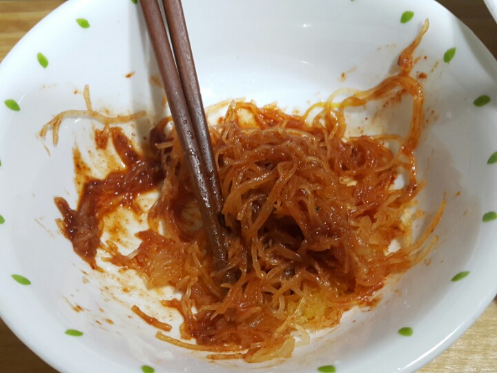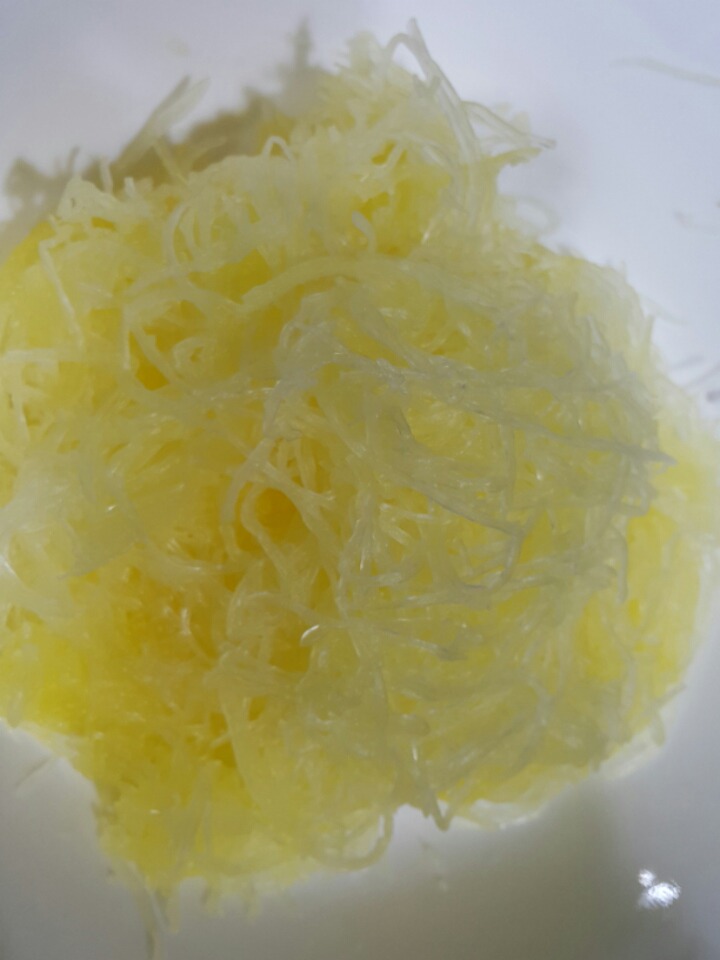 육질이 단단하여 30분 정도는 삶아야 물러지더군요. 삶은 호박은 찬물에 담그고 주물럭 주물럭 하면 살은 모조리 면이 되고 껍질만 고스란히 남습니다.