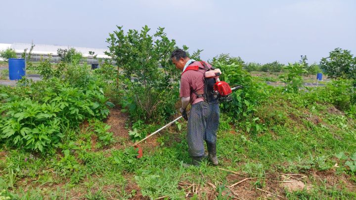 예초기로 밭 가장자리 긴풀 김매기도 합니다.