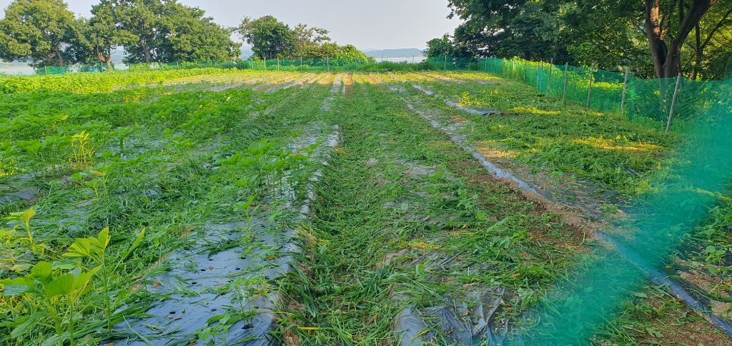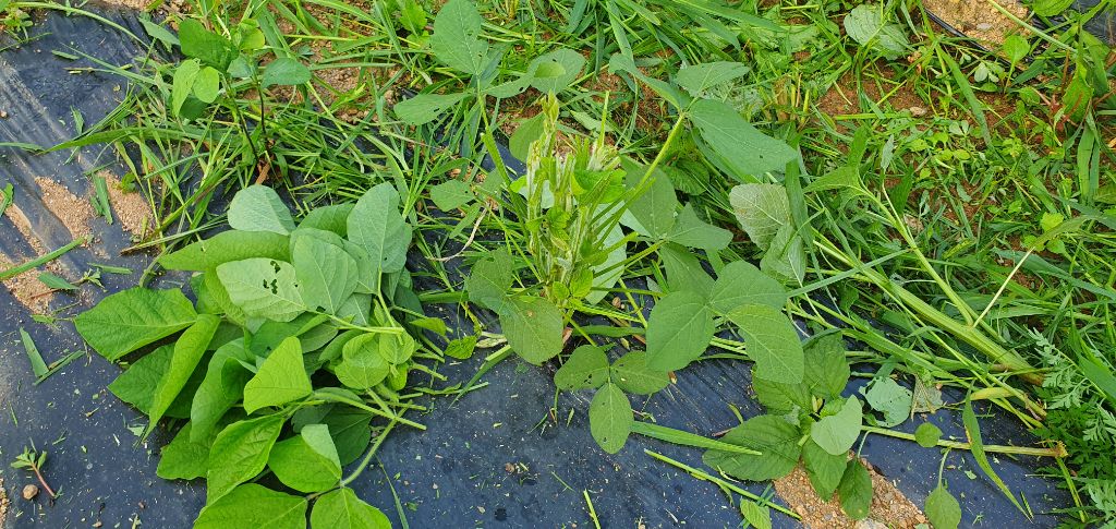 절반 500평은 7월8일 직파했습니다. 오늘은 6월17일 직파한 콩순을 쳐주었습니다. 기간을 달리한 콩을 서로 비교해봅니다.