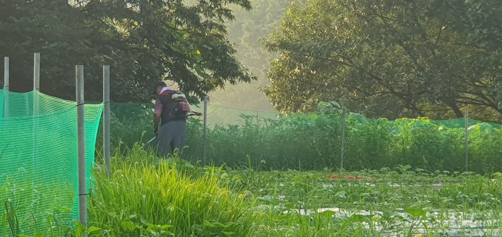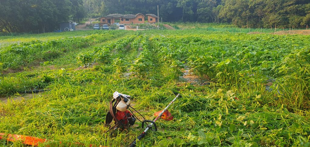 새벽 5시부터 예초기로 콩밭 김매기와 낫으로 순지르기를 했습니다. 들깨도 제법 자라서 순을 지르고 다듬어 갑니다.