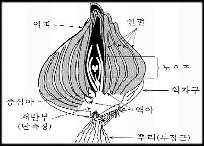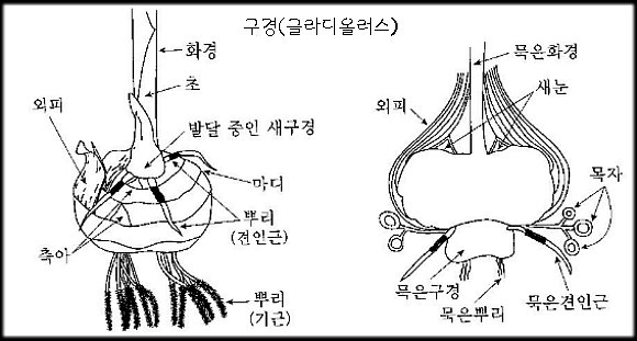 줄기가 비대하여 원형의 양분저장기관을 이룬 것으로서 구근에는 마디가 있으며 잎의 기부는 얇은 외피로 변해 구근을 둘러싸고 있다.
