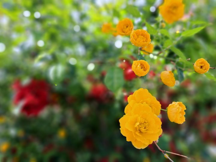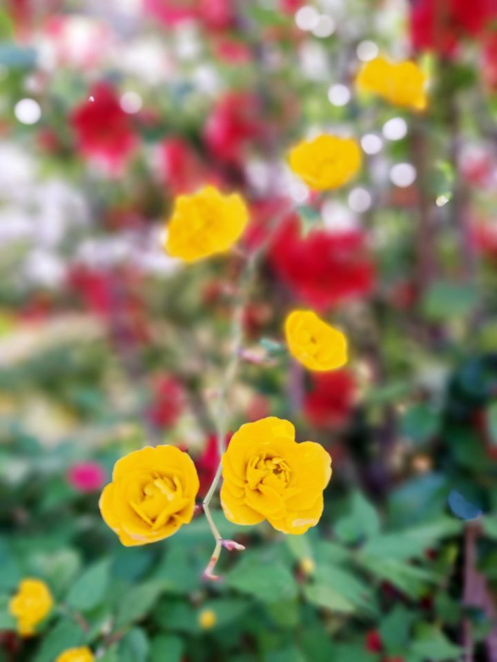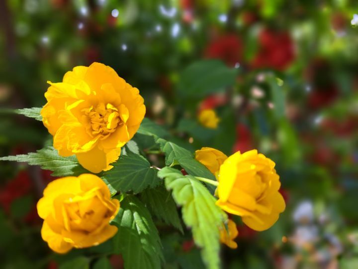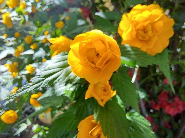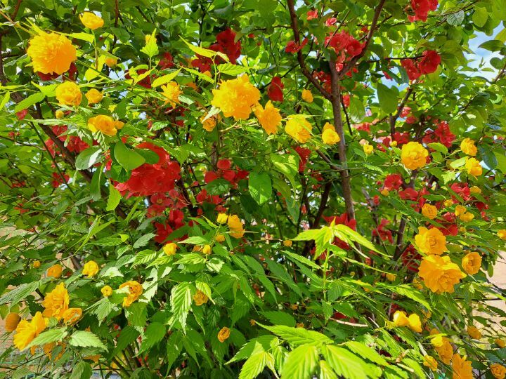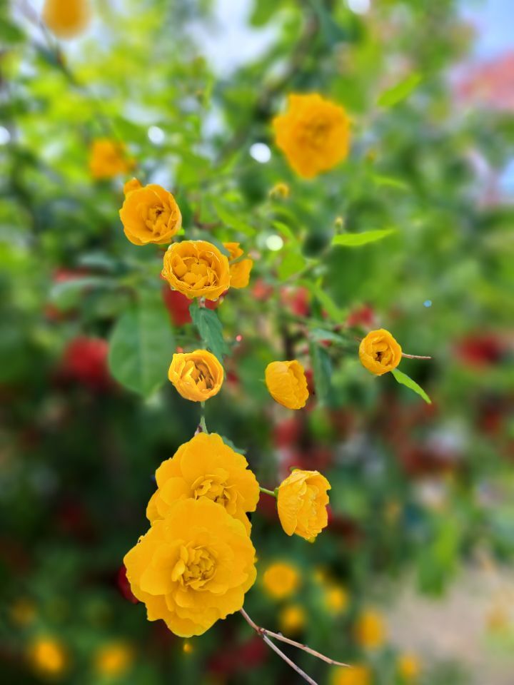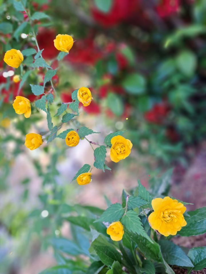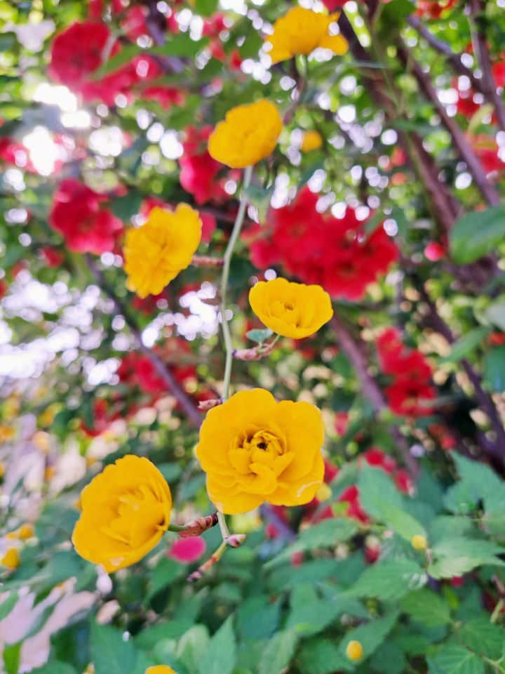 장미를 닮은 겹황매가 폈는데 넘 이뻐서 함께 구경해요 ^^ 명자나무와 함께 합식했는데.. 명자꽃 먼저 핀 상태에서 황매가 핍니다.