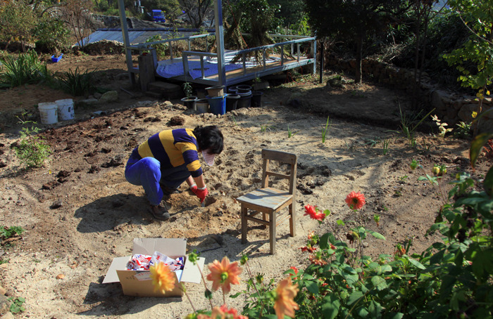 아내는 수선화를 심고선