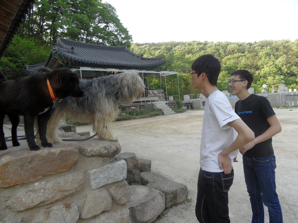 절에 있는 검둥이와 털털이강아지를보고 울애들이 귀여워해요
