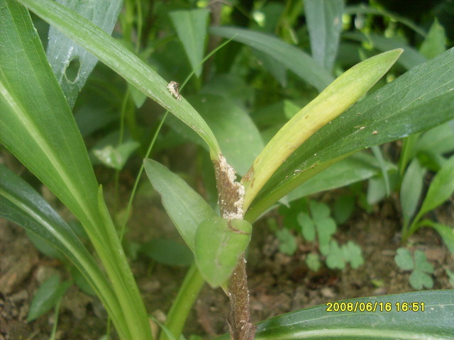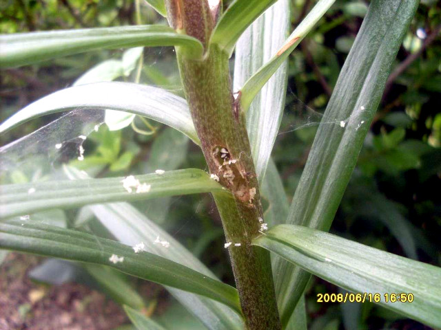 줄기쪽에 하얗게 소복히 쌓인게 병인 줄 알았는데 쌓인 것을 털어내 보니 구멍이 있었고 구멍안에서 벌레가 입을 내밀었다 집어 넣었다 하면서 약올리고 있었어요. 꼬챙이로 고놈 빼내려고 애먹다가 결국은 나리가 댕강 ....처음 작은 나리는 고놈 벌레가 댕강내 버렸구요. 으이고.. 약올라. 결국 고놈도 내손에 갔지만...내 나리 돌리도~ -