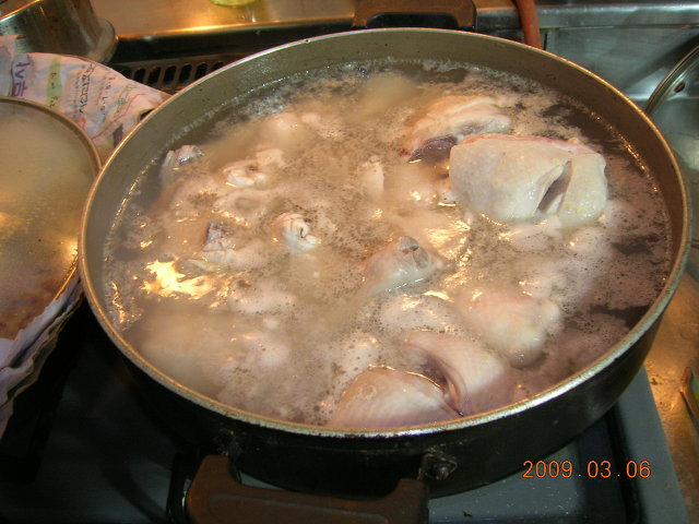 팔팔 끓인 물에 닭고기를 넣어 살짝 데치후 찬물에 헹굼니다. ㅎㅎㅎ