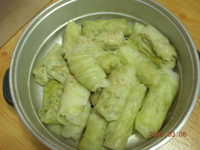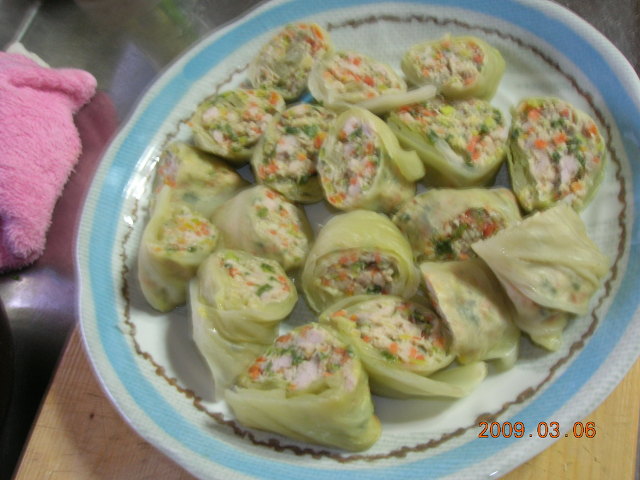 살짝 데친 양배추에 윗 사진의 재료를 넣어 돌돌 말아서 찜솥에 찌면 양배추만두가 됩니다