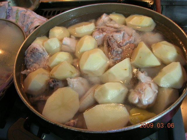 씻어놓은 닭과 감자,마늘,고추장,고추가루등등을 넣고