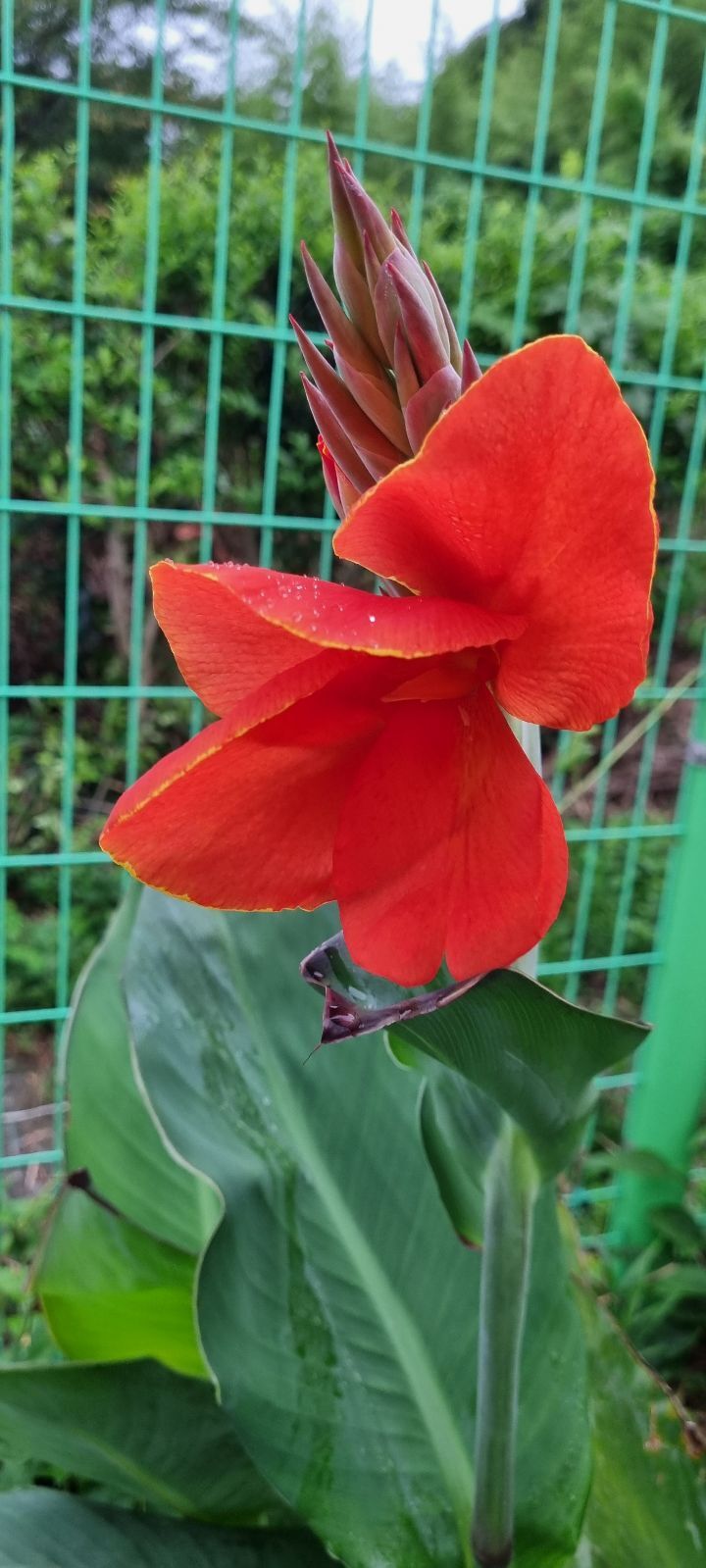 KTX로 서울 병원에 정기검진 가는 남편을 배웅하고 일찍 온 꽃밭의 대문을 열자 오늘 새로 피어난 빨간 칸나양이 반깁니다.