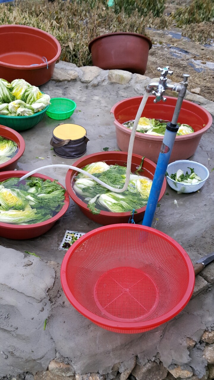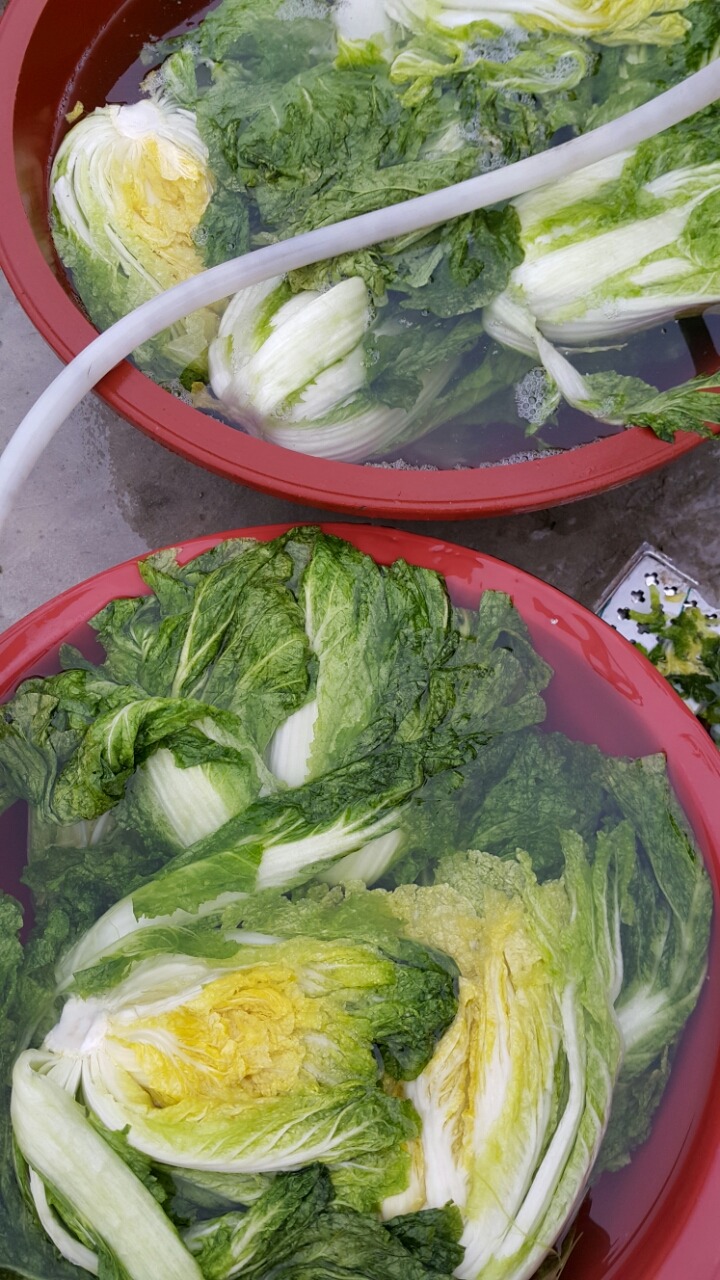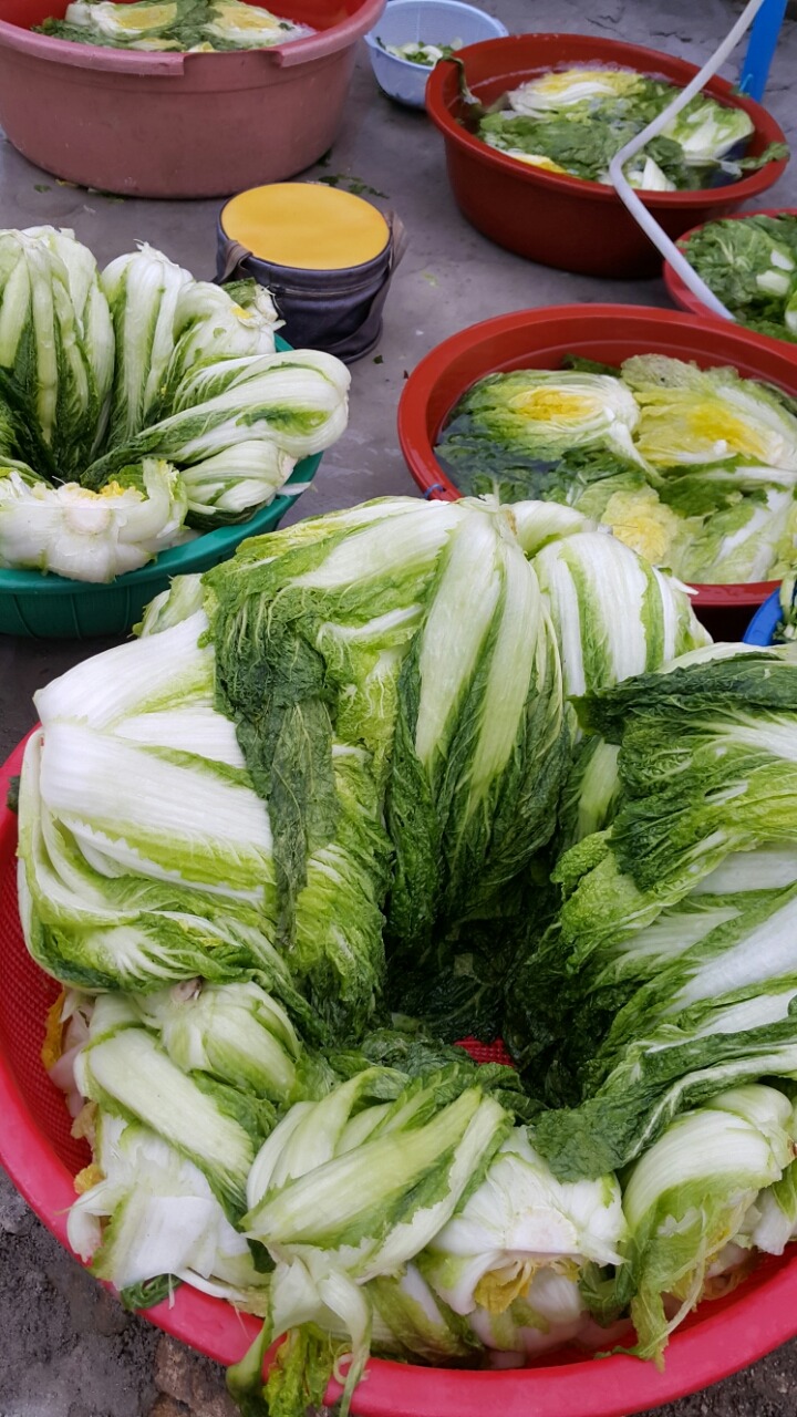 배추뽑아 절였어유