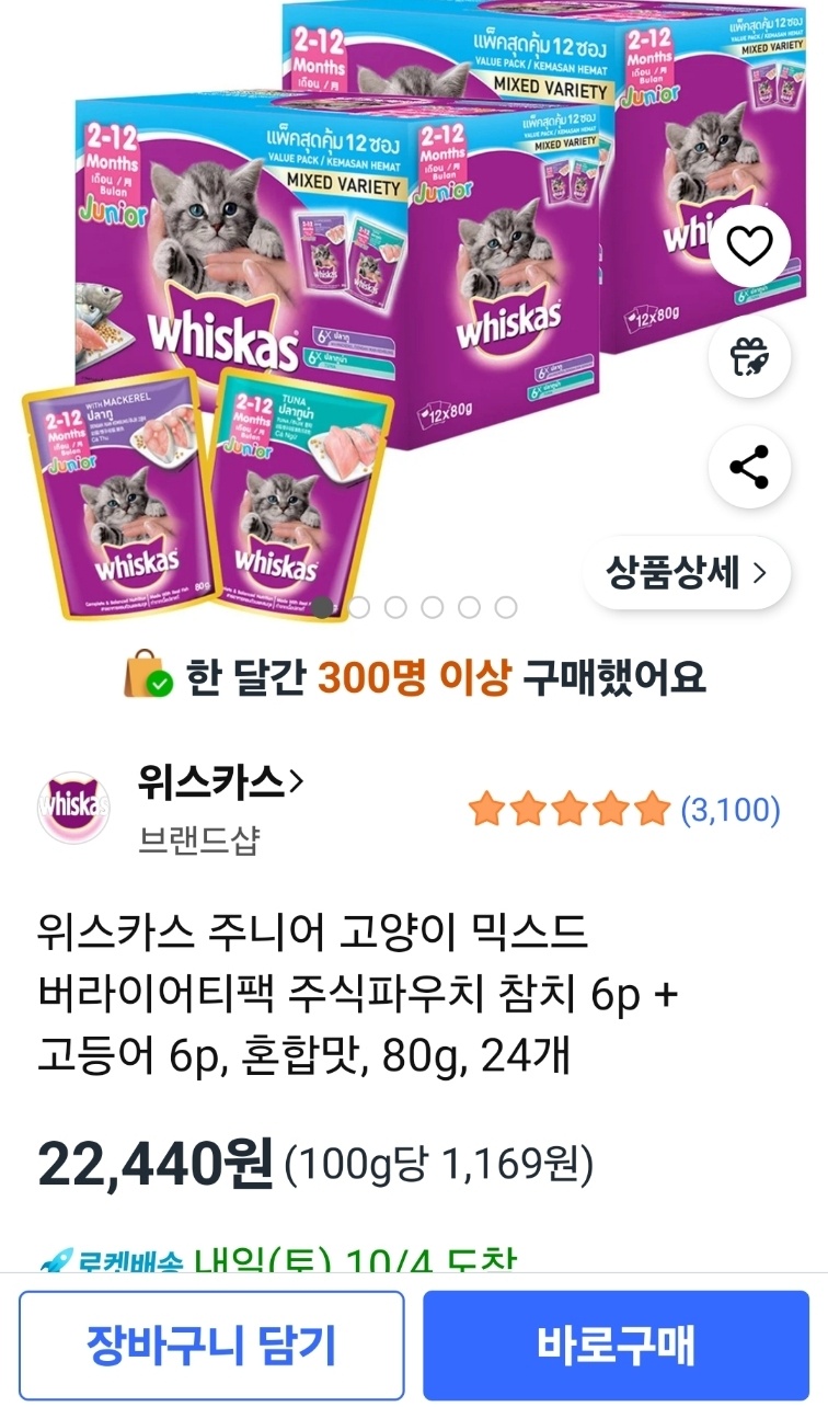 위스카스 주니어 고양이 믹스드 버라이어티팩 주식파우치 참치 6p + 고등어 6p