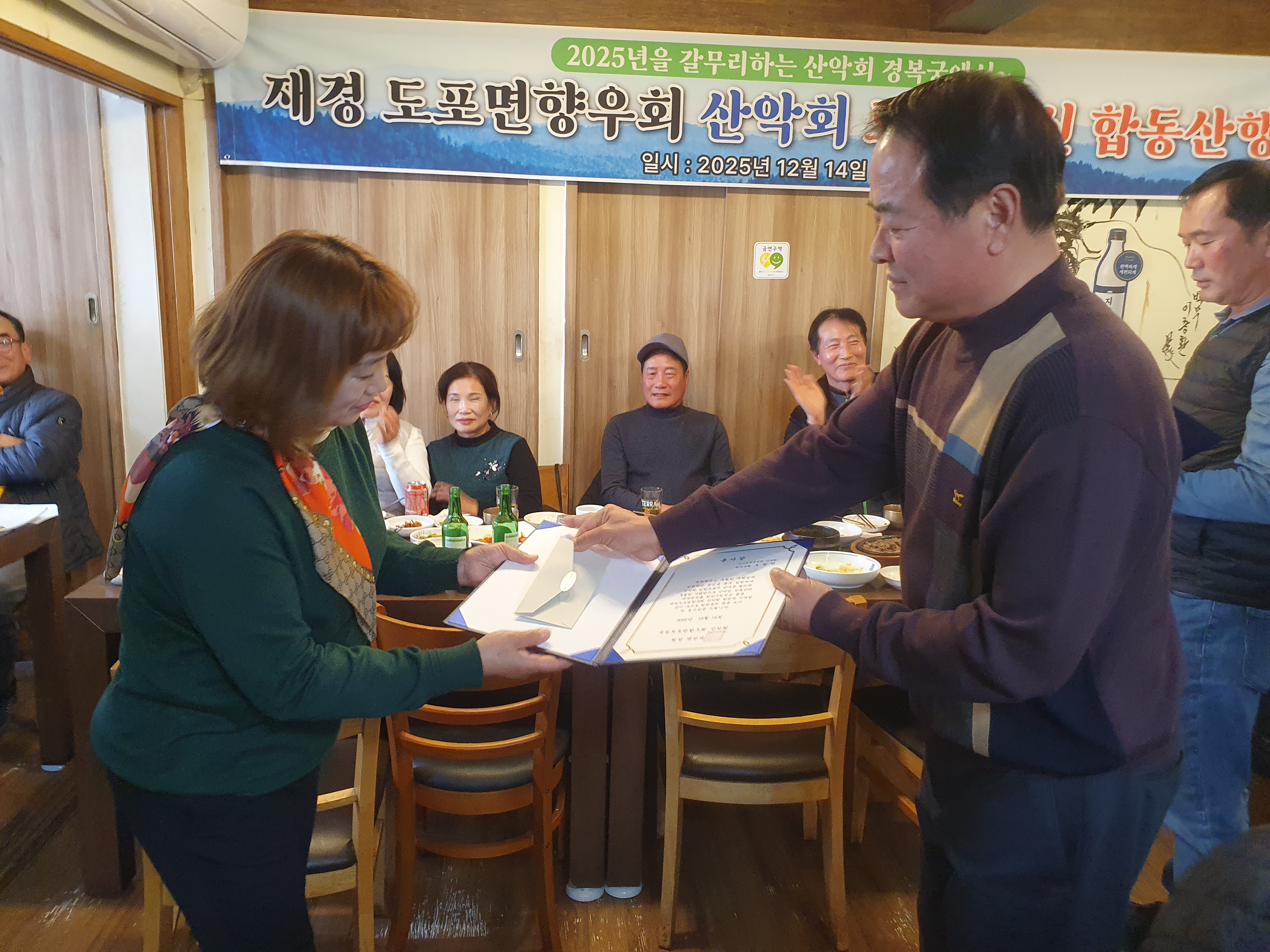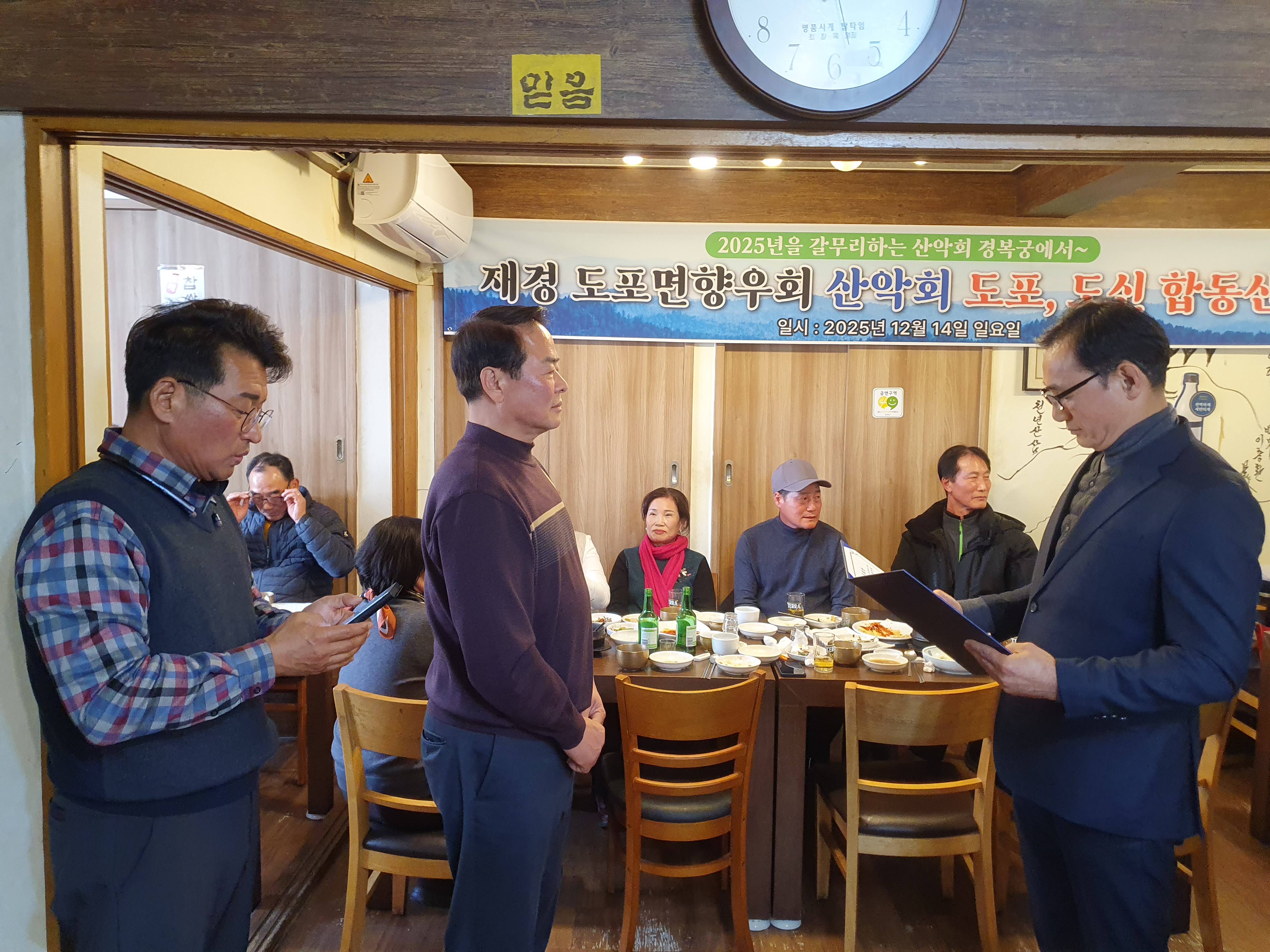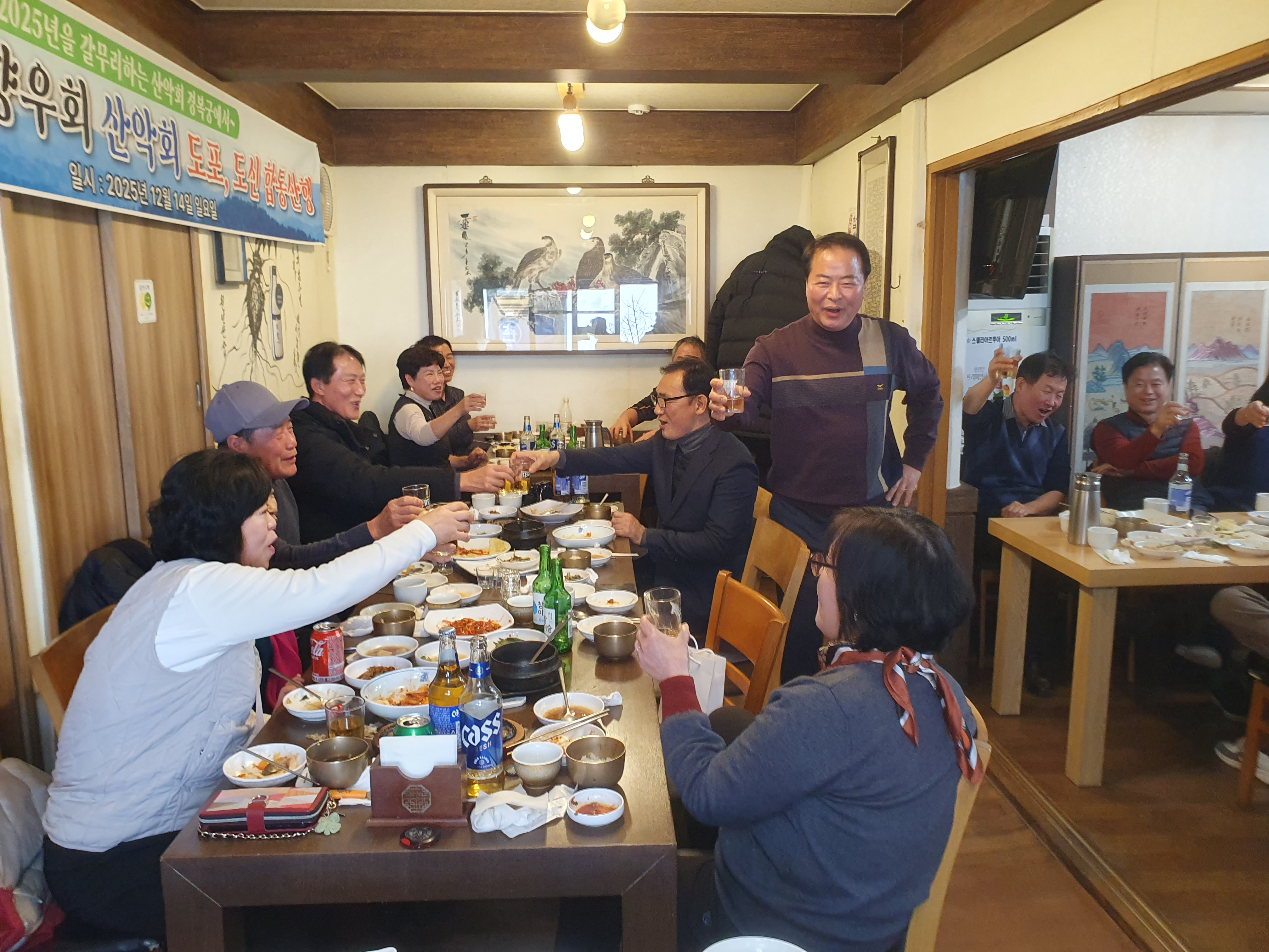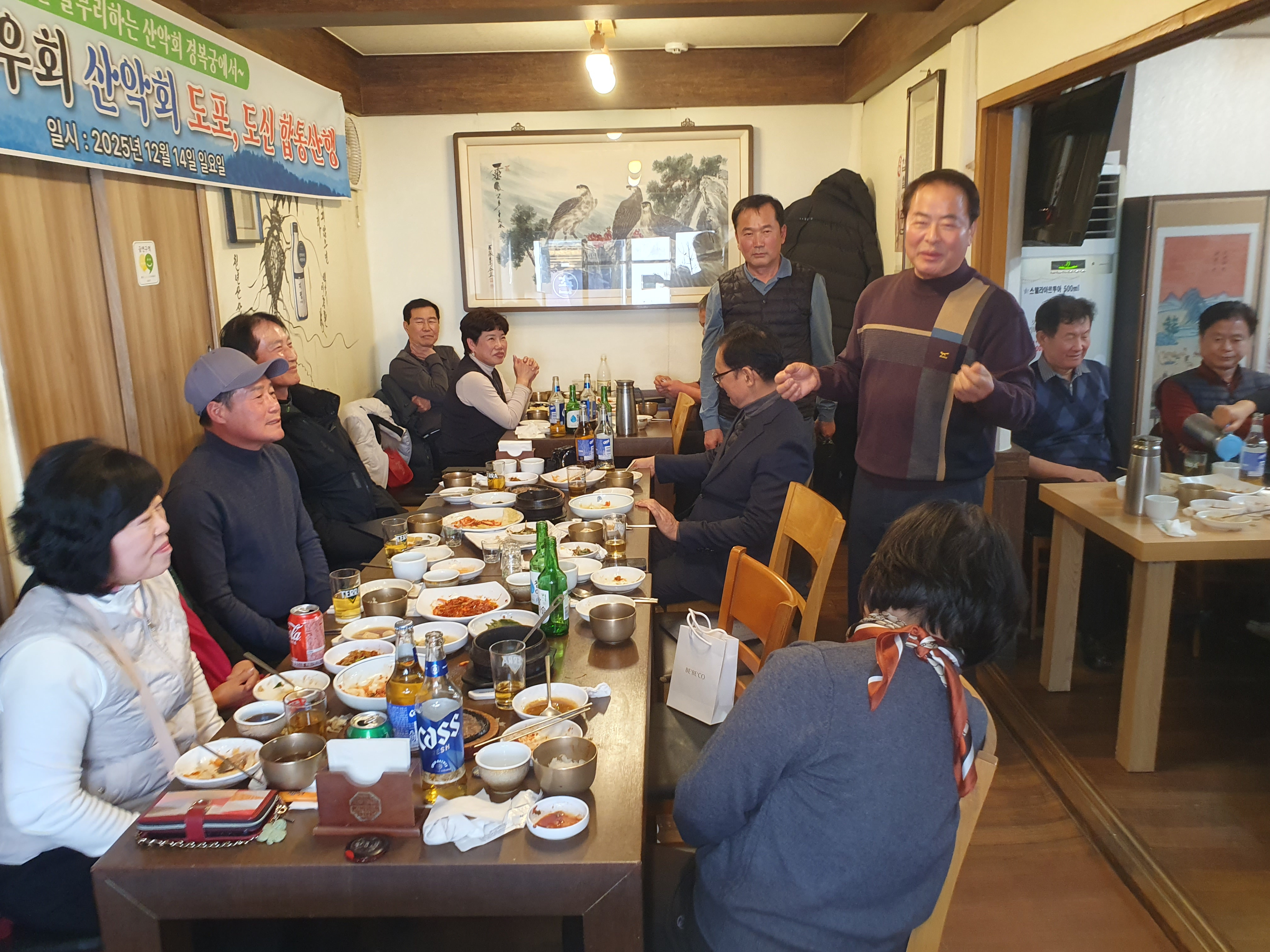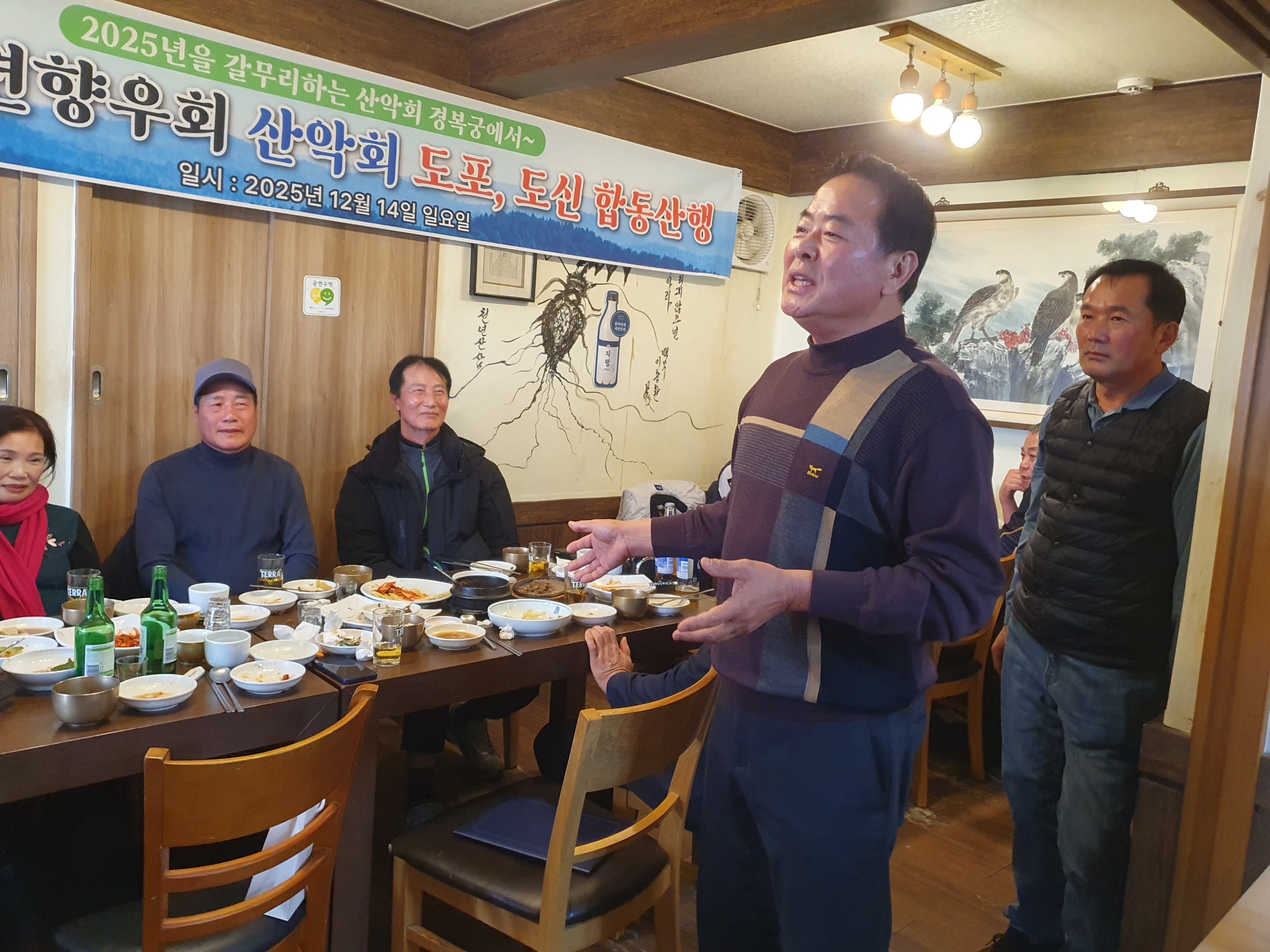 곽찬대 산악회장은 갈무리하는 송년 산행 소감에서 “도포산악회는 2013년도에 처음 발걸음을 하여 임시 산행을 진행해오다가 2026년에 정식 발족해 초대회장으로 곽찬대, 2대 주만석(3년) 회장에 이어 다시 3대 곽찬대 회장으로 이어왔다” 고 역사를 밝히면서 “저는 6년 간 산악회장을 맡아왔다” 며 “저는 올해부로 모든 임무를 내려놓게 돼있다. 지나온 시간을 되돌아보니 아쉬움도 있지만, 좋았던 일도 많았던 순간에 교차한다. 과거의 선택이나 결과에 대한 미련, 이루지 못한 꿈이나 놓친 기회가 있었던 것 같다. 하지만 좋았던 일을 그 과정에서 얻은 성장, 소중한 인연, 즐거웠던 경험 등 긍정적인 기억이 남는다” 고 되돌아보면서 “후회만 남는 것이 아니라, 그 경험을 통해 더 나은 자신을 만들어가는 계기가 됐다” 고 말했다.