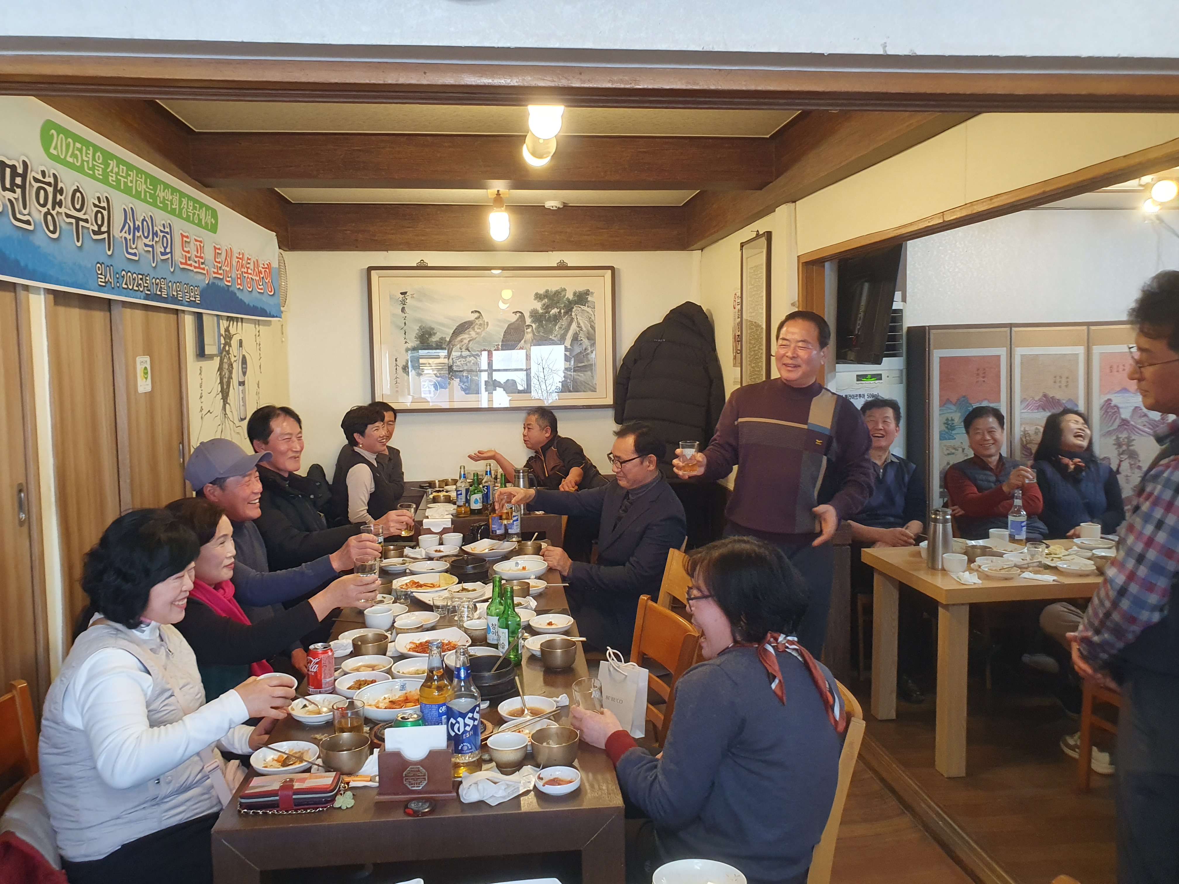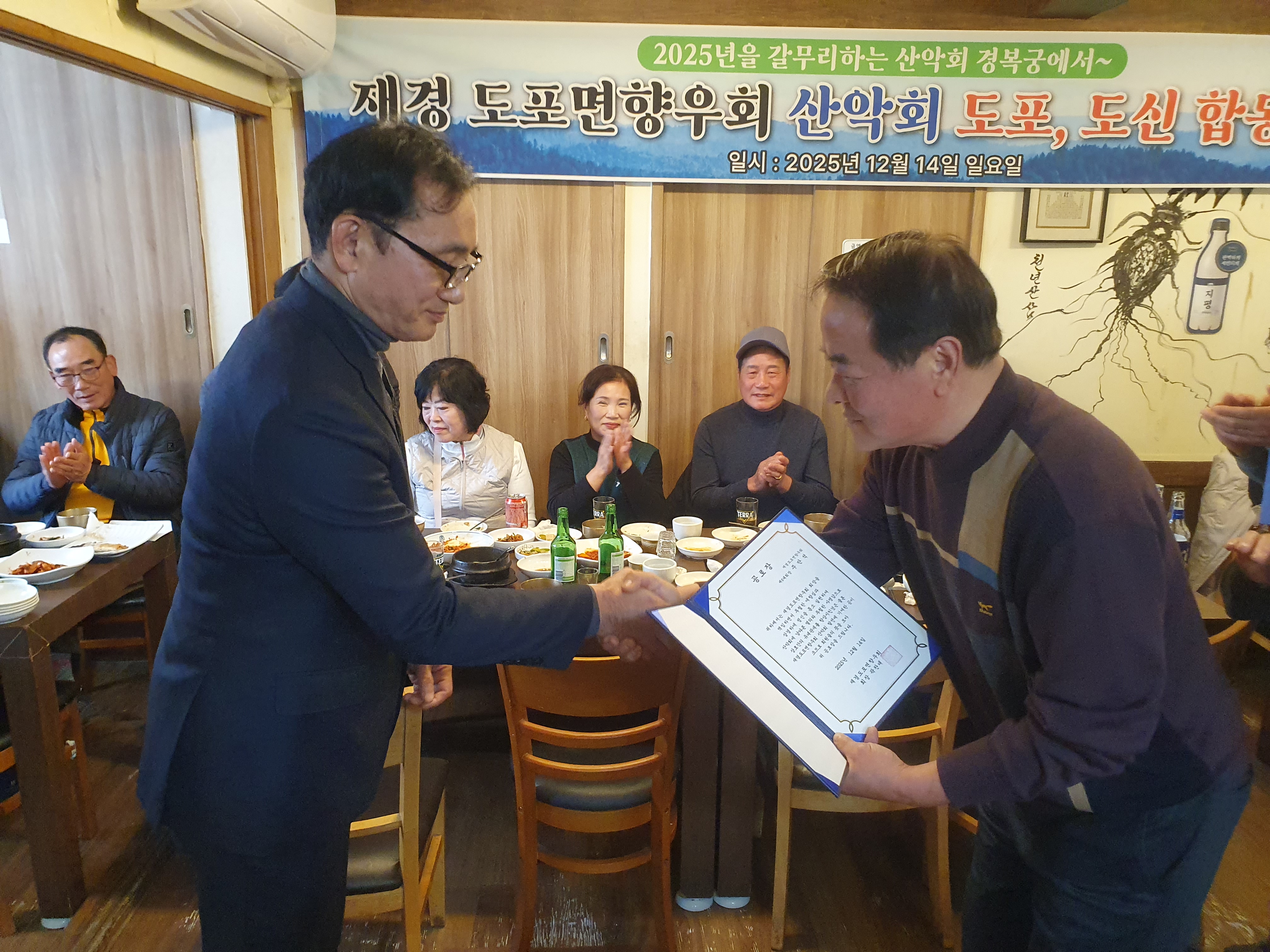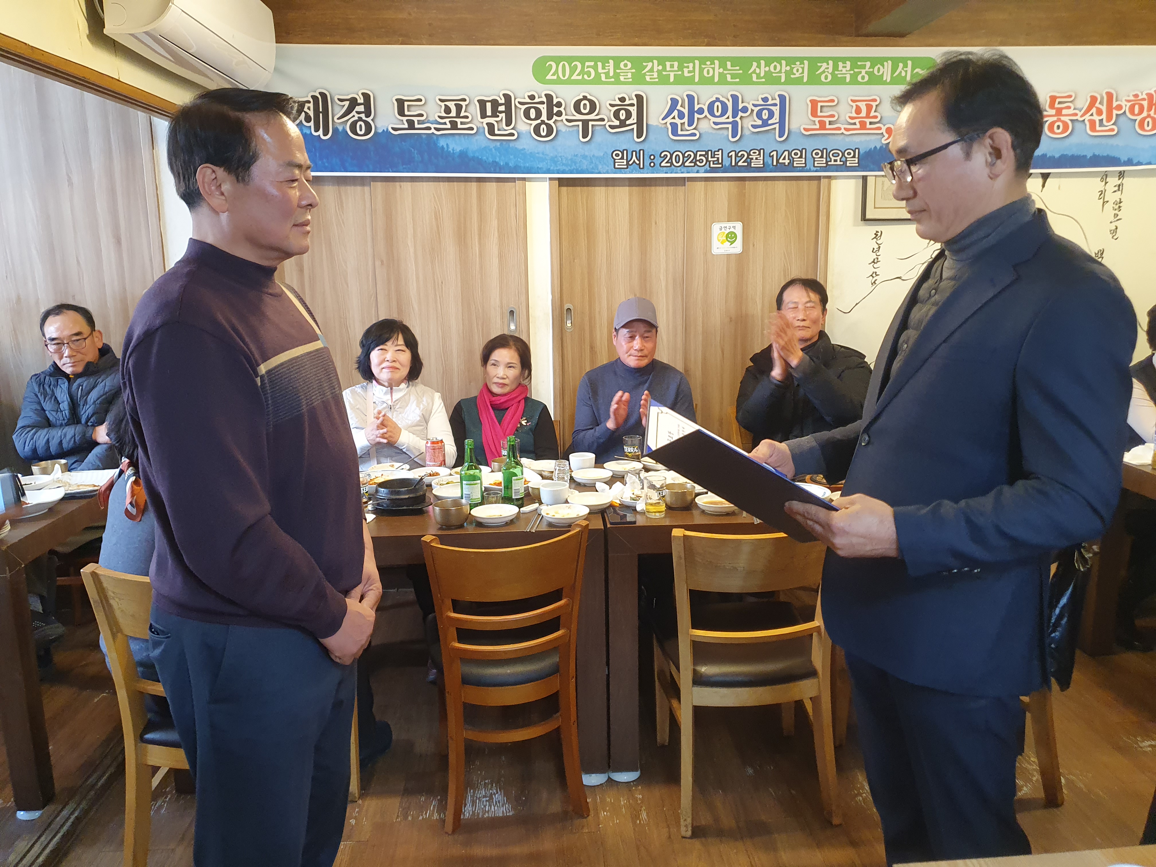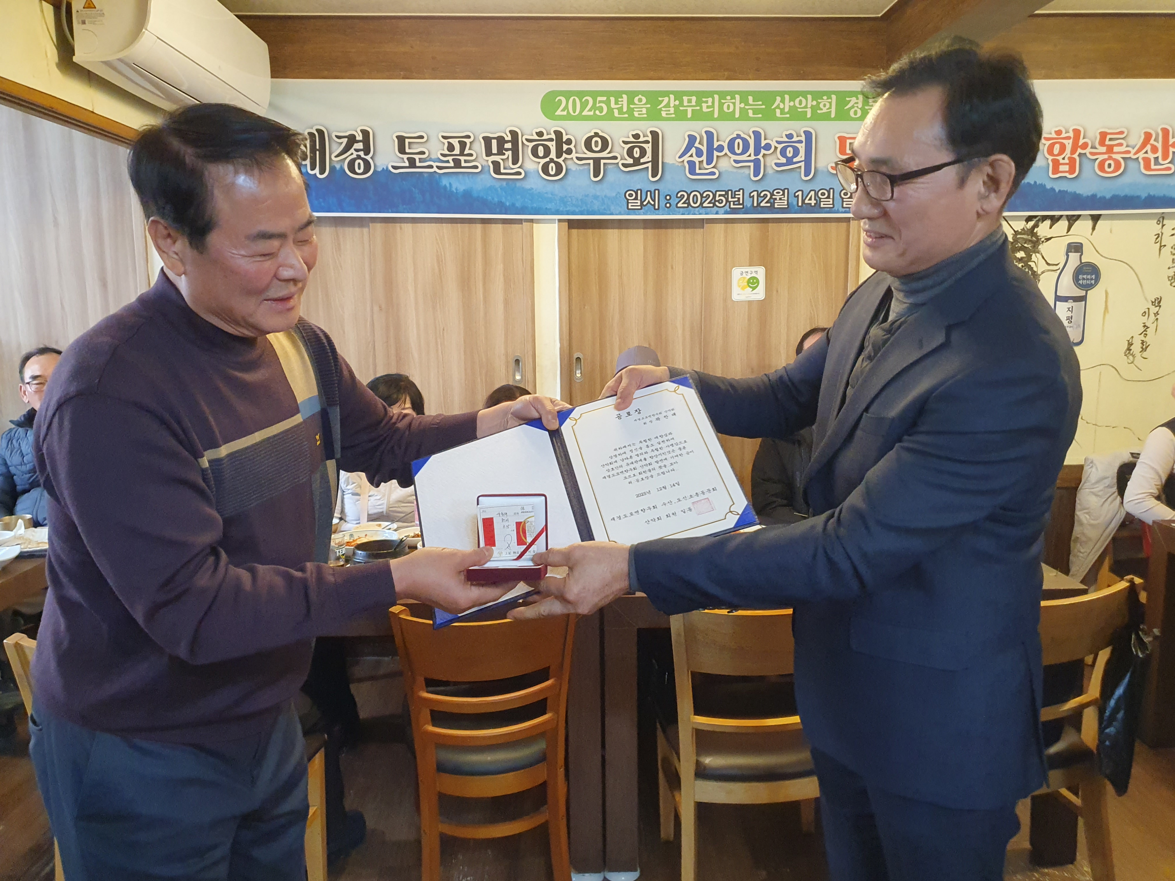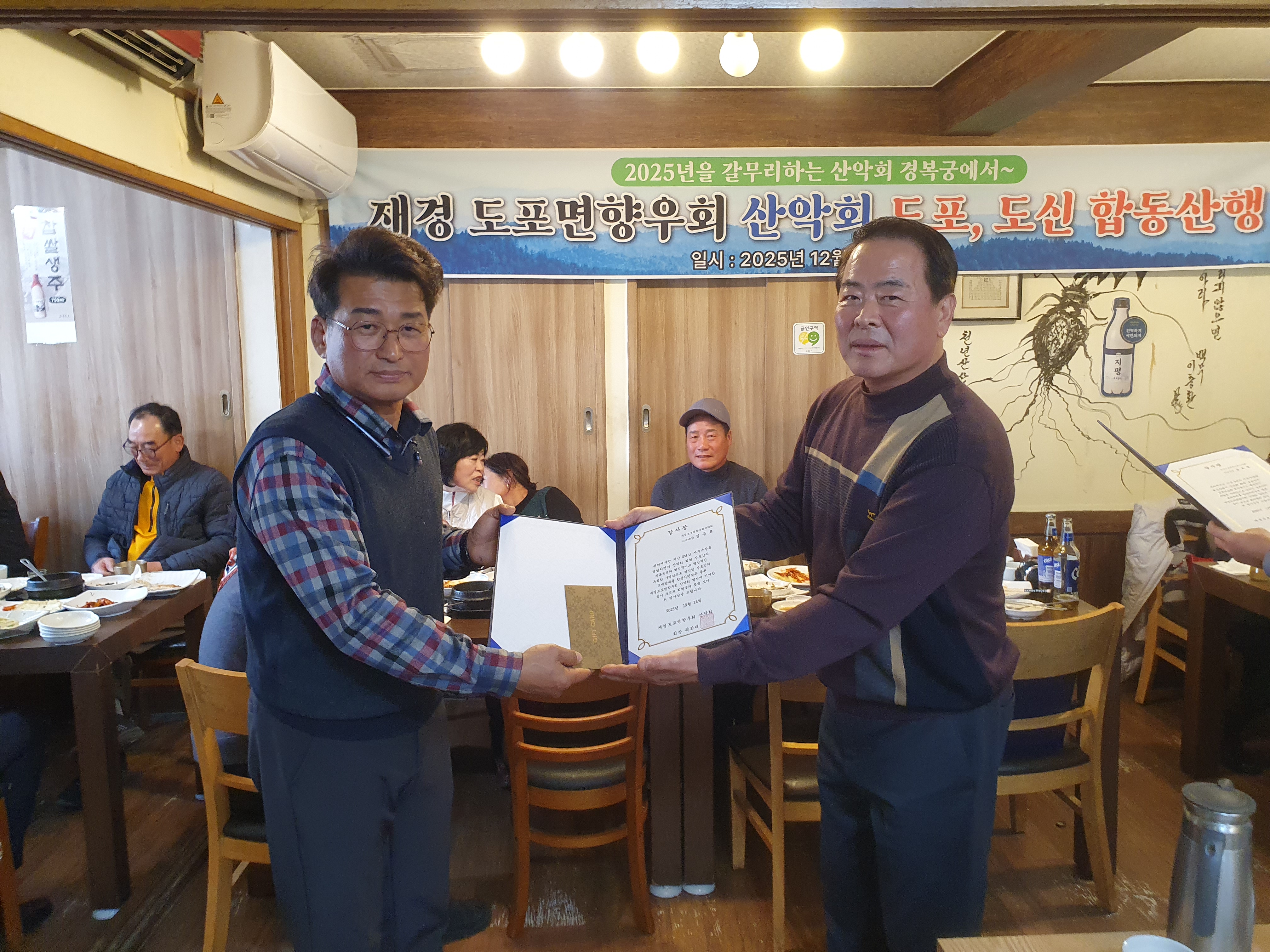 곽찬대 산악회장은 갈무리하는 송년 산행 소감에서 “도포산악회는 2013년도에 처음 발걸음을 하여 임시 산행을 진행해오다가 2026년에 정식 발족해 초대회장으로 곽찬대, 2대 주만석(3년) 회장에 이어 다시 3대 곽찬대 회장으로 이어왔다” 고 역사를 밝히면서 “저는 6년 간 산악회장을 맡아왔다” 며 “저는 올해부로 모든 임무를 내려놓게 돼있다. 지나온 시간을 되돌아보니 아쉬움도 있지만, 좋았던 일도 많았던 순간에 교차한다. 과거의 선택이나 결과에 대한 미련, 이루지 못한 꿈이나 놓친 기회가 있었던 것 같다. 하지만 좋았던 일을 그 과정에서 얻은 성장, 소중한 인연, 즐거웠던 경험 등 긍정적인 기억이 남는다” 고 되돌아보면서 “후회만 남는 것이 아니라, 그 경험을 통해 더 나은 자신을 만들어가는 계기가 됐다” 고 말했다.