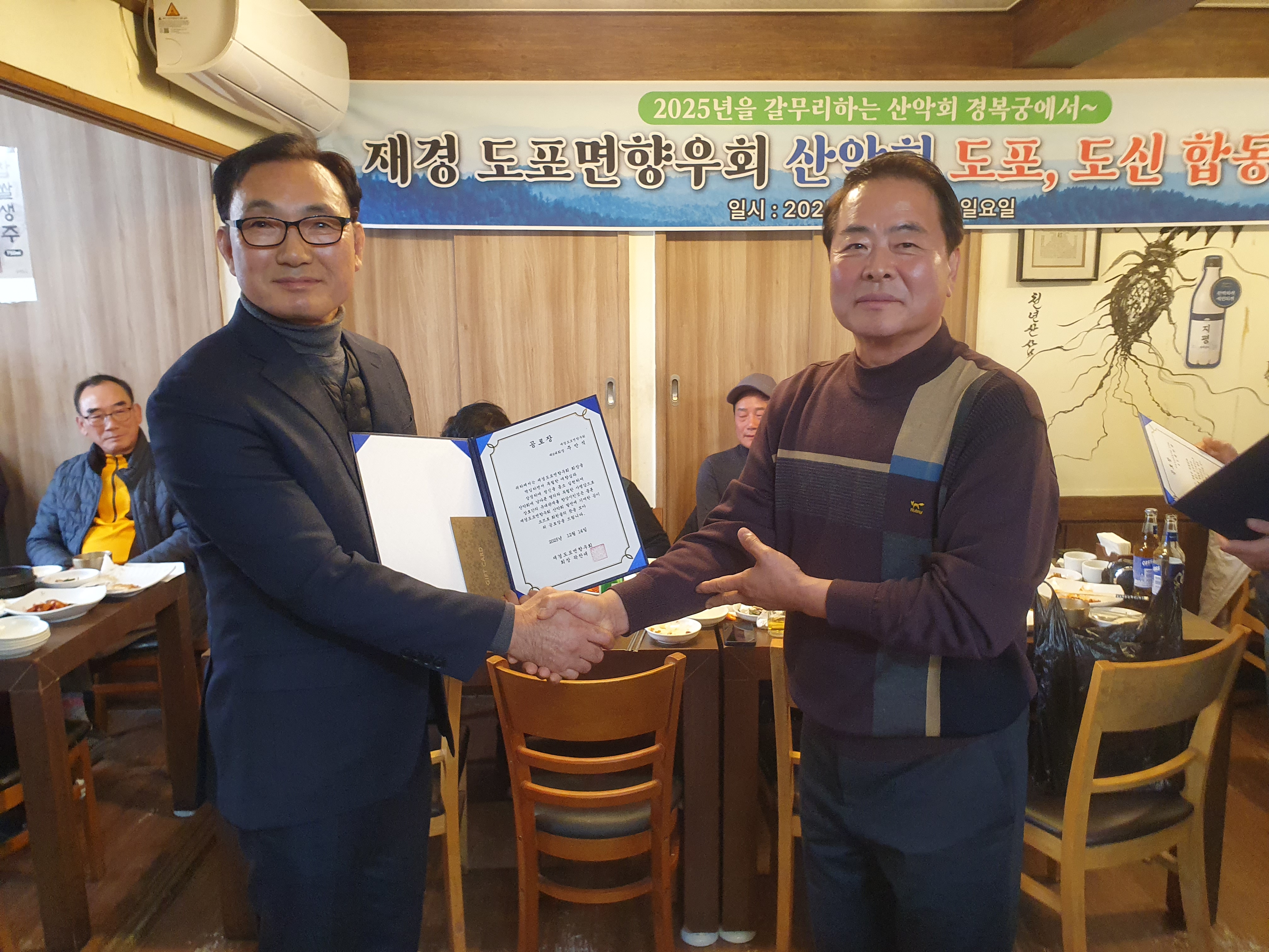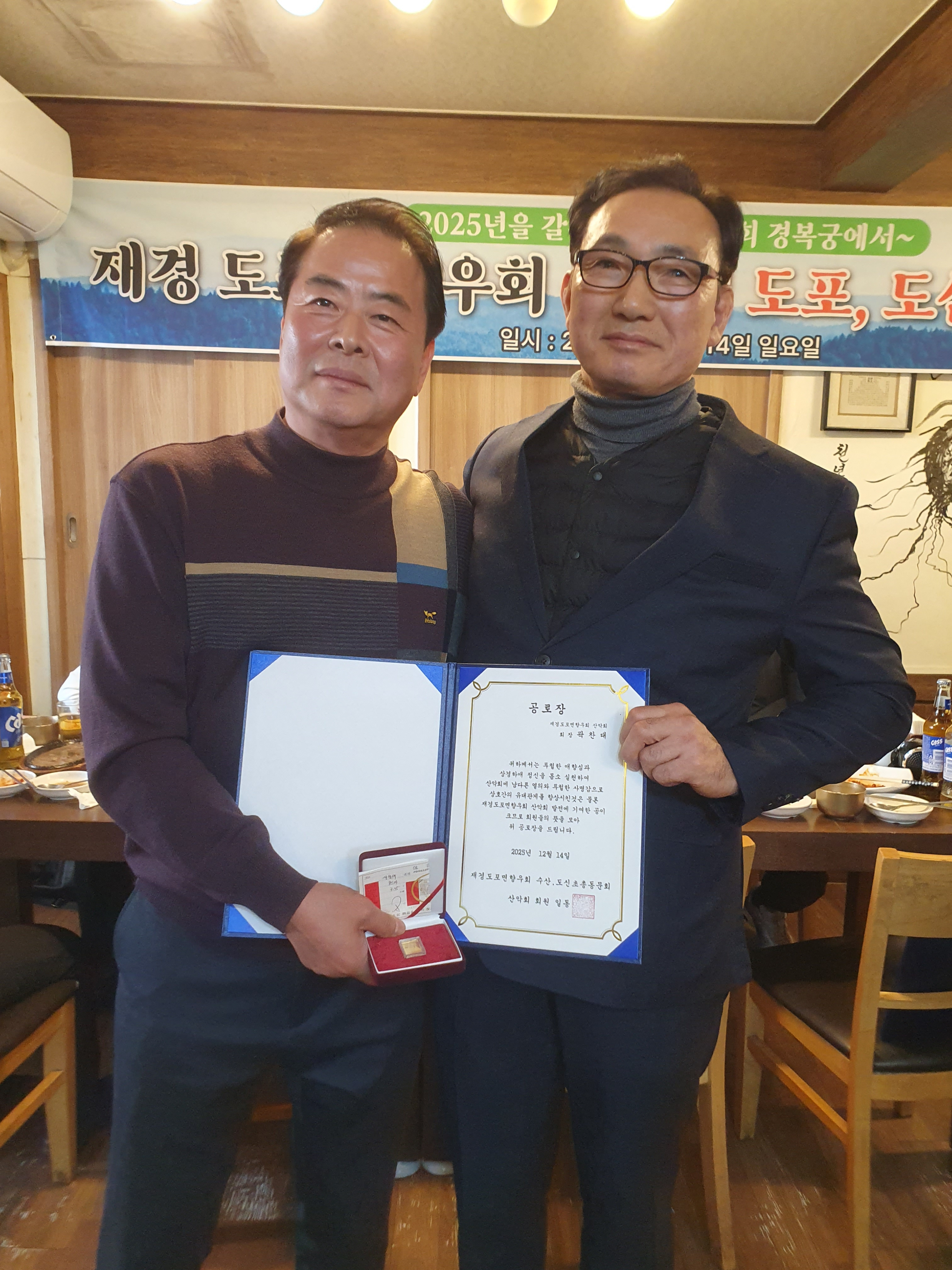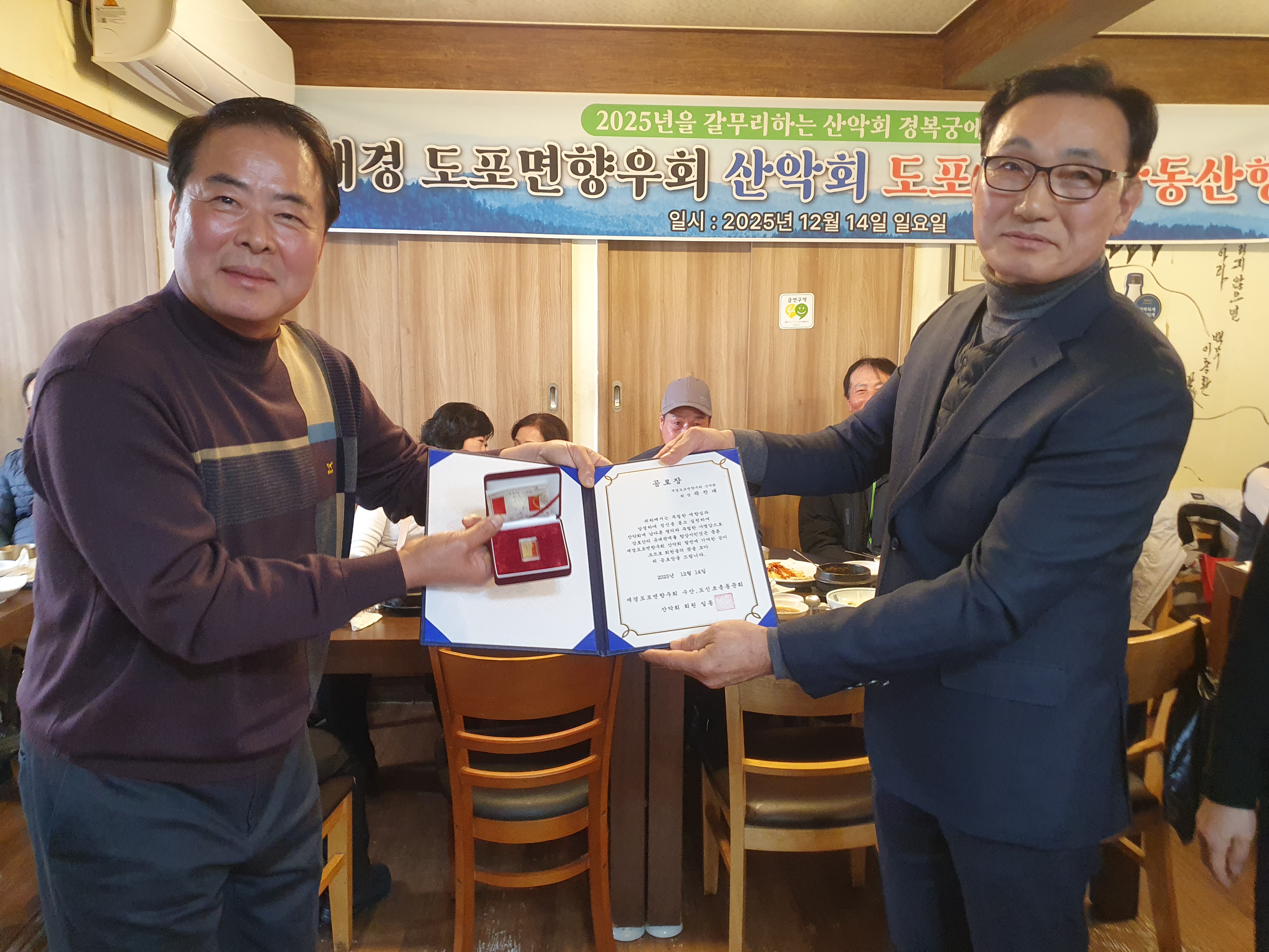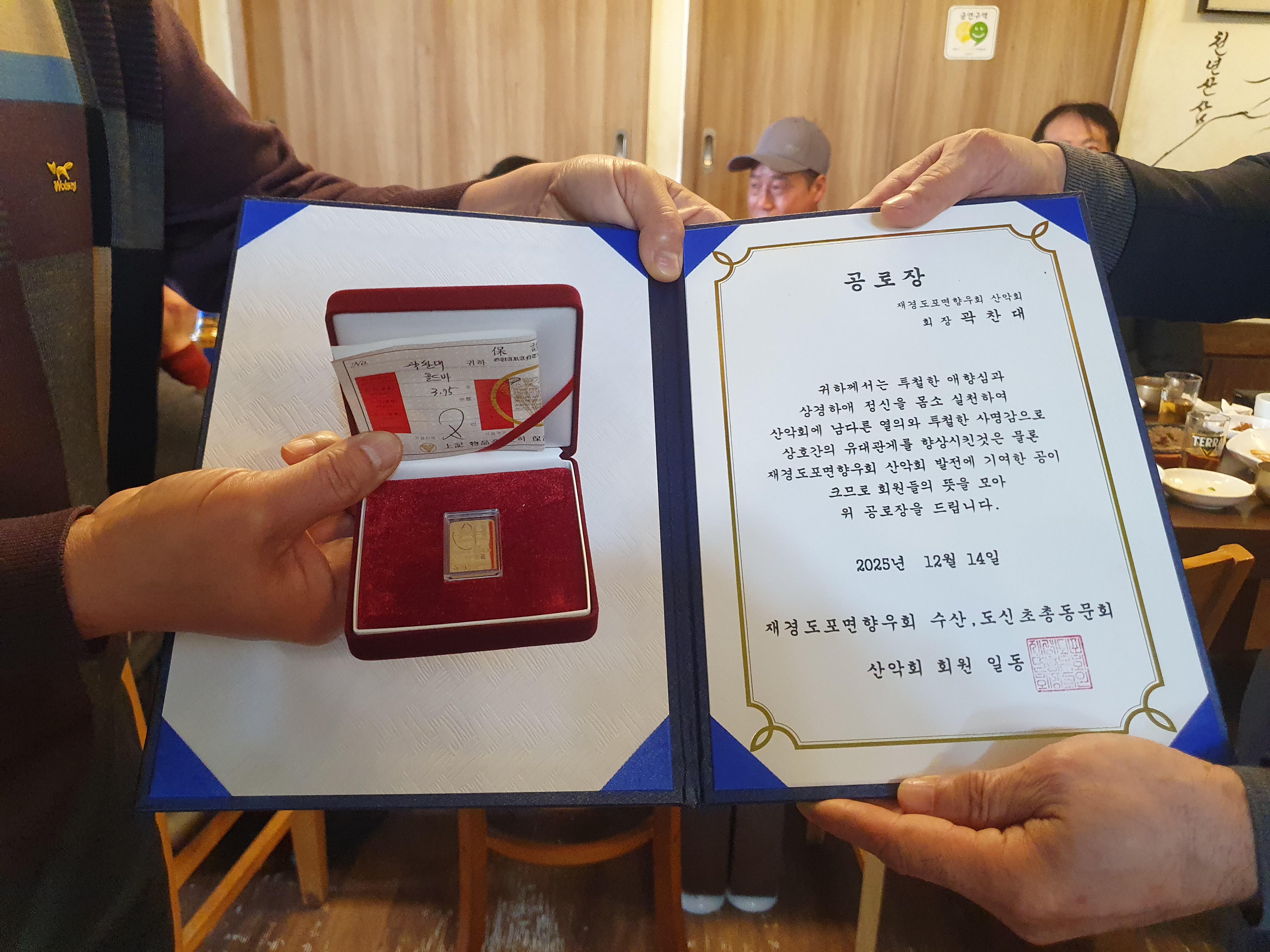 공로장에는 곽찬대 회장이 주만석 향우회장으로부터 산악회에 남다른 열의와 투철한 사명감으로 상호간의 유대관계를 향사키고, 향우회와 산악회 발전에 크게 공을 세워 이 상을 수여했다. 공로장과 함께 부상으로 ‘금 한 돈’ 을 증정했다.
