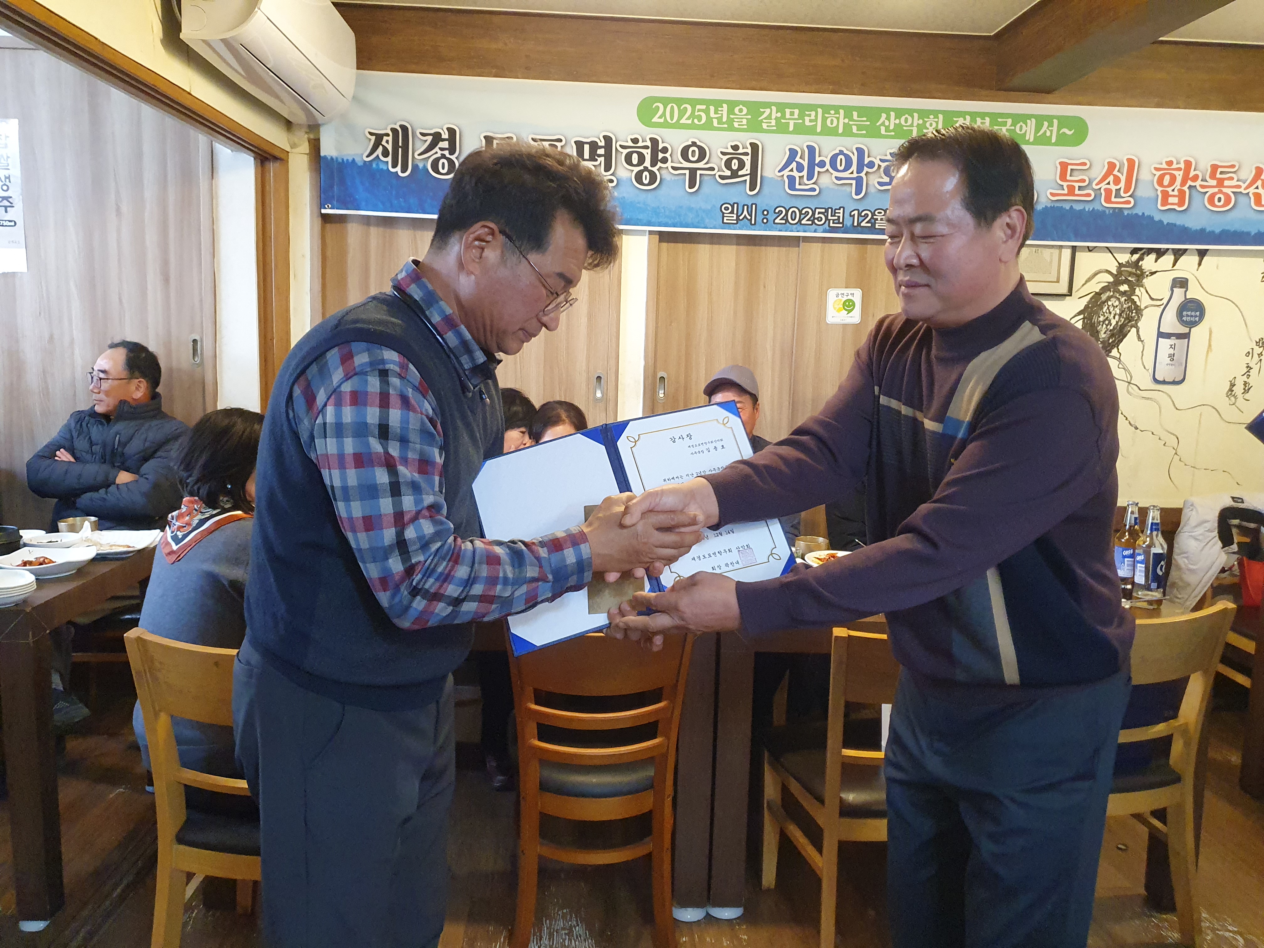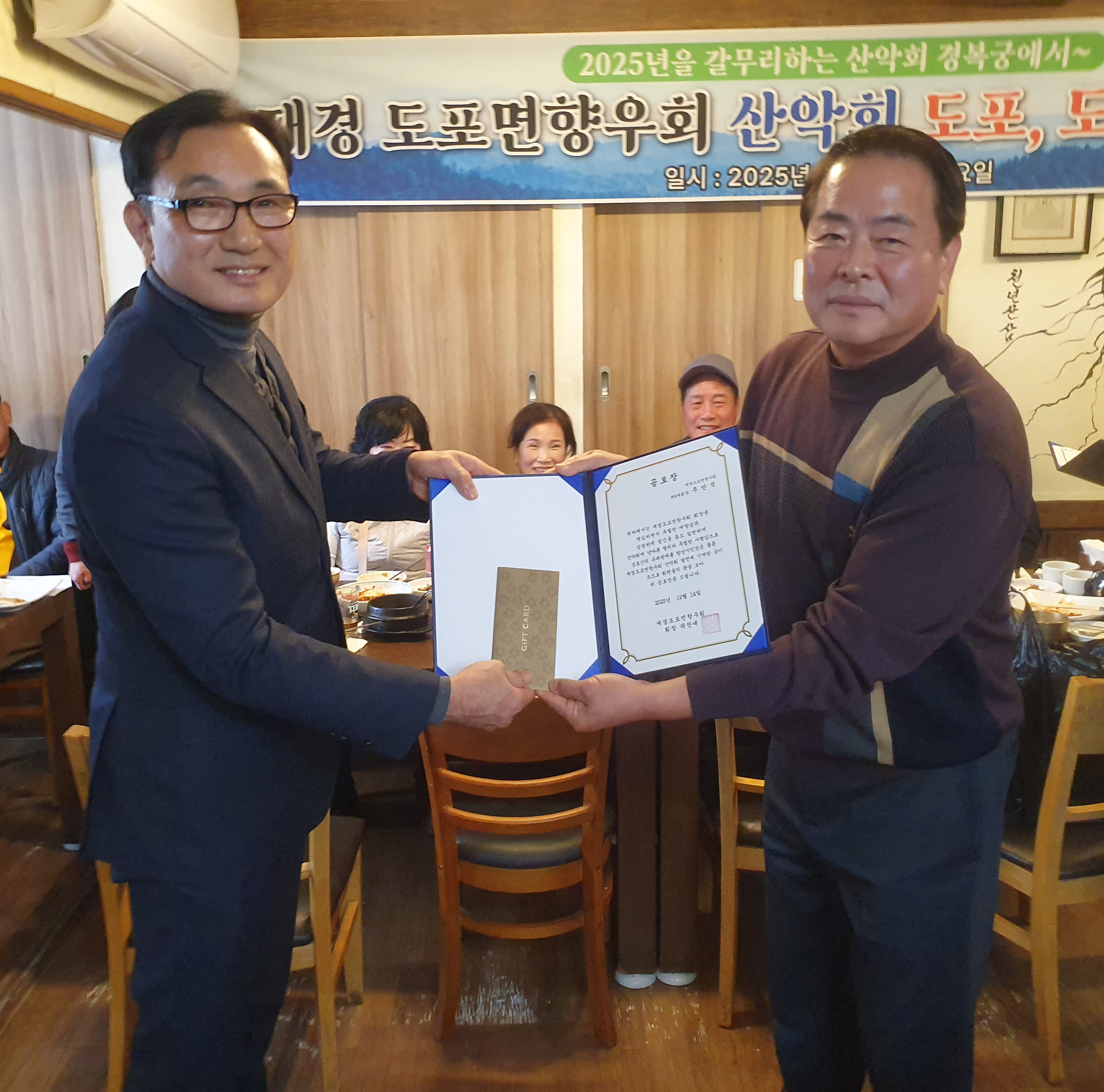 그리고 곽찬대 산악회장은 주만석 향우회장에게 산악회 발전에 힘을 실어주고, 회원들의 화합을 도모하는 공으로 공로장을 수여했다. 부상으로 상품권을 증정했다.