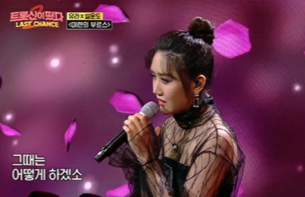 유라 가수는 트로트계의 여왕 이미자, 하춘화 대선배와 그리고 이번 심사위원들로 나선 트롯신인 김연자, 주현미, 장윤정 등 선배들처럼 나도 트로트계의 여제로 군림하겠다고 고수가 북을 치며 추임새를 넣듯 "얼씨구 지화자 좋구나, 얼쑤" 했다.