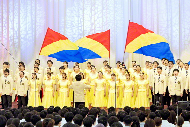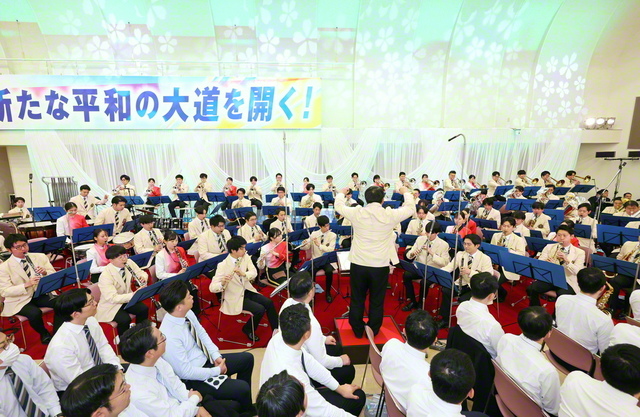 음악대(音樂隊) 시나노(しなの)합창단과 여성부(女性部) 후지(富士)합창단의 학회가(學會歌) ‘세계광포(世界廣布)의 노래’와 함께 음악대 소카르네상스뱅가드의 화려한 삼색플래그가 참석자의 마음을 고무(鼓舞)시켰다.