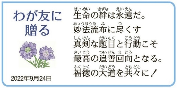 11월의 교학부임용시험(敎學部任用試驗)을 향해 각지에서 연찬의 숨결이 높아지고 있다. 지금 이 때, 수험자와 그 도전을 격려하는 사람이 쌓은 ‘신심(信心)의 추억’은 최고의 보물로 빛나간다. 시험에 도전하는 한 사람 한 사람을 전력으로 응원하자. (燦)