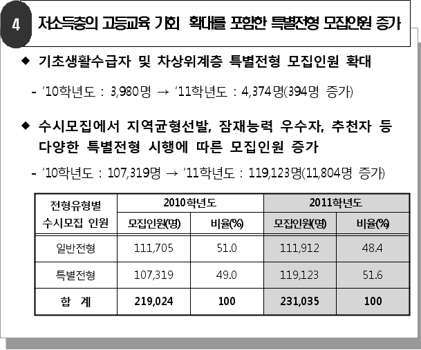 - 저소득층의 고등교육기회 확대를 포함한 특별전형 모집인원 증가