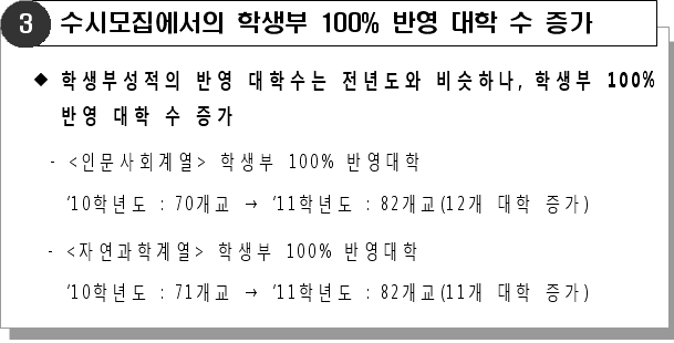 ○ 학교생활기록부 반영은, 100% 반영하는 대학이 5개교(2009년 6개 대학), 80% 이상~100% 미만 반영하는 대학은 3개 대학(2009년 1개 대학), 60% 이상~80% 미만 반영대학은 6개교(2009년 6개교), 40% 이상~60%미만 반영 대학은 89개 대학(2009년 87개교)으로 전년도와 전반적으로 유사하다(일반전형 인문계열 기준).