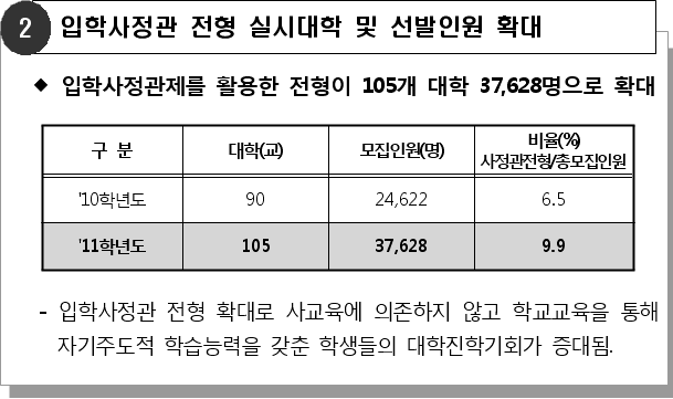 - 입학사정관 전형 실시 대학 및 선발 인원 확대