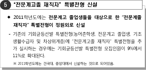○ 기존의 기회균등선발 특별전형(농어촌학생, 전문계고 졸업생, 기초생활수급자 및 차상위계층)에 “전문계고졸 재직자” 특별전형을 추가 실시하는 경우에는 기회균등선발 특별전형 모집인원이 9%에서 11%로 확대된다.