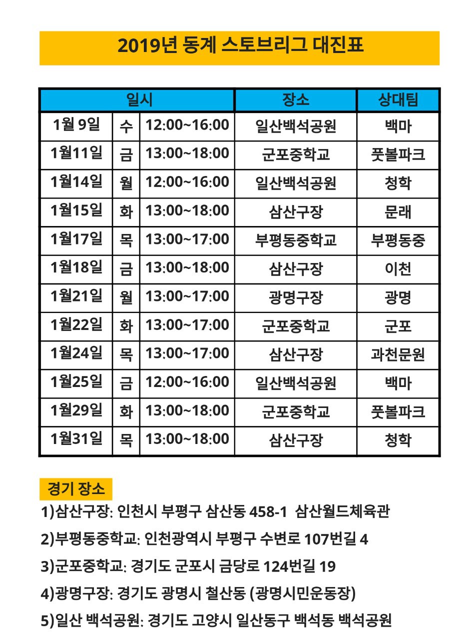 2019년 1월 스토브리그 일정. 작성자45기 이현서 부 이찬호|작성시간19.01.06|조회수210 목록 댓글 1 글자크기 작게가 글자크기 크게가 2019년 스토브리그 일정을 알려드립니다. 다음검색 현재 게시글 추가 기능 열기 북마크 공유하기 신고 센터로 신고 댓글 댓글 1 댓글쓰기 답글쓰기 댓글 리스트 작성자45기 이현서 부 이찬호 작성자 본인 여부 작성자 | 작성시간 19.01.14 14일 일정은 일기관계로 인해 변경되었습니다. 확인 즉시 공지토록 하겠습니다. 댓글 전체보기