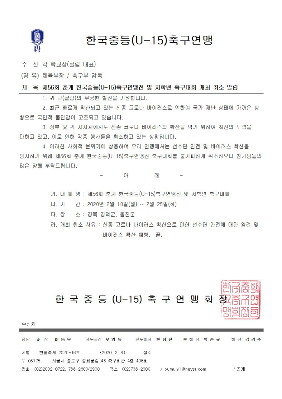 춘계대회 취소 (신종 코로나 바이러스 이슈) 작성자46기 신지상아빠 신석훈|작성시간20.02.12|조회수93 목록 댓글 0 글자크기 작게가 글자크기 크게가 다음검색 현재 게시글 추가 기능 열기 북마크 공유하기 신고 센터로 신고 댓글 댓글 0 댓글쓰기 답글쓰기 댓글 리스트