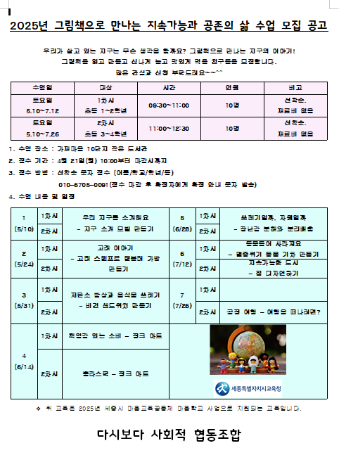 - 이 사업은 세종시 교육청에서 진행하고 '다시보다 사회적 협동조합'에서 위탁받아 운영합니다.