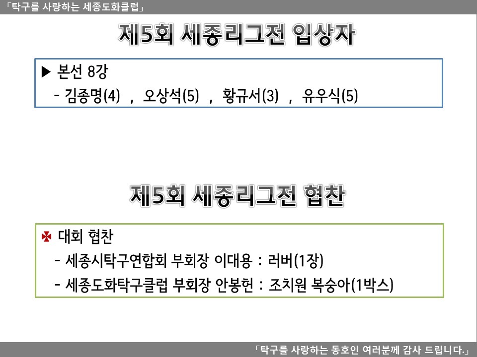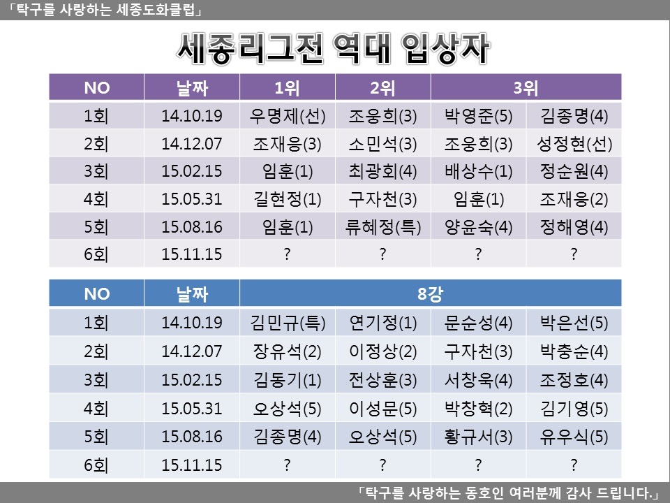 제5회 세종리그전(결과) 작성자좋은날(김준현)|작성시간15.08.24|조회수141 목록 댓글 0 글자크기 작게가 글자크기 크게가 다음검색 현재 게시글 추가 기능 열기 북마크 공유하기 신고 센터로 신고 댓글 댓글 0 댓글쓰기 답글쓰기 댓글 리스트