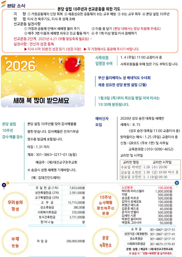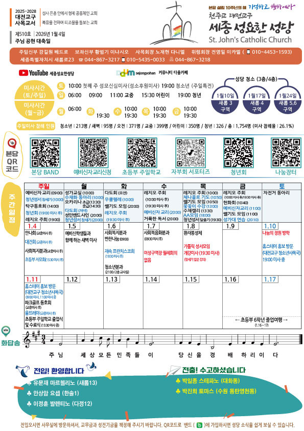주보-제510호 2026.1.4. 주님 공현 대축일 작성자신소영레지나|작성시간26.01.03|조회수330 목록 댓글 0 글자크기 작게가 글자크기 크게가 다음검색 현재 게시글 추가 기능 열기 북마크 공유하기 신고 센터로 신고 댓글 댓글 0 댓글쓰기 답글쓰기 댓글 리스트