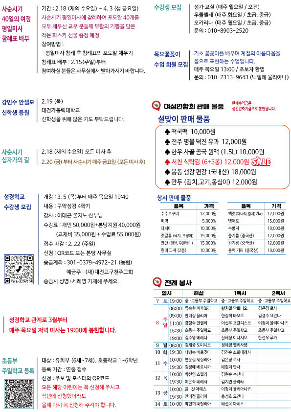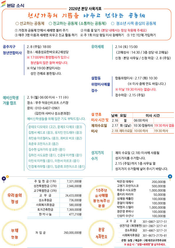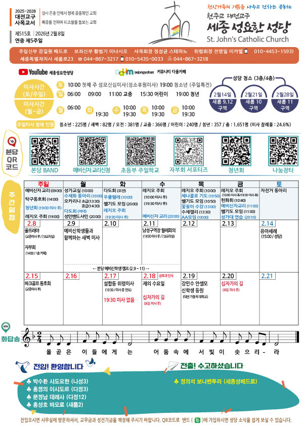주보-제515호 2026.2.8. 연중 제5주일 작성자신소영레지나|작성시간26.02.07|조회수404 목록 댓글 0 글자크기 작게가 글자크기 크게가 다음검색 현재 게시글 추가 기능 열기 북마크 공유하기 신고 센터로 신고 댓글 댓글 0 댓글쓰기 답글쓰기 댓글 리스트