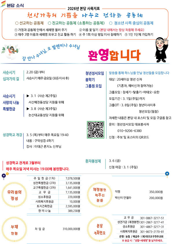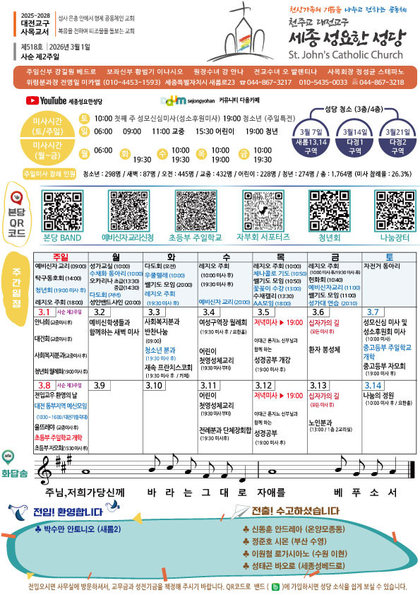주보-제518호 2026년 3월 1일 사순 제2주일 작성자신소영레지나|작성시간26.02.28|조회수381 목록 댓글 0 글자크기 작게가 글자크기 크게가 다음검색 현재 게시글 추가 기능 열기 북마크 공유하기 신고 센터로 신고 댓글 댓글 0 댓글쓰기 답글쓰기 댓글 리스트