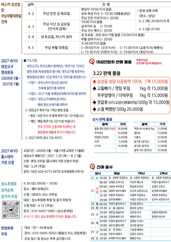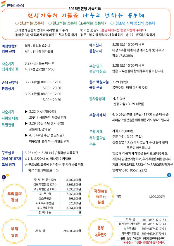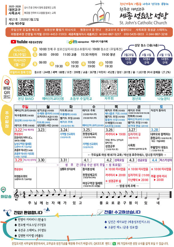 주보-제521호 2026년 3월 22일 사순 제5주일 작성자신소영레지나|작성시간26.03.21|조회수102 목록 댓글 0 글자크기 작게가 글자크기 크게가 다음검색 현재 게시글 추가 기능 열기 북마크 공유하기 신고 센터로 신고 댓글 댓글 0 댓글쓰기 답글쓰기 댓글 리스트