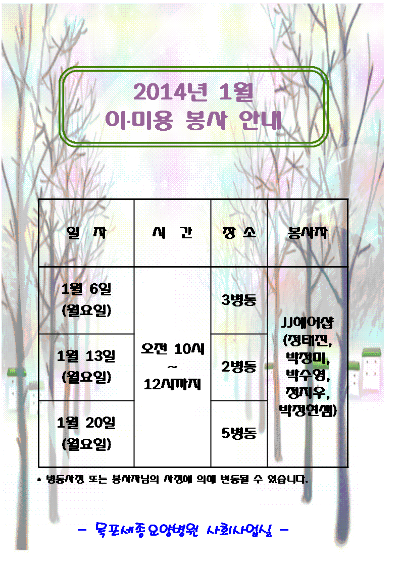2014년 1월 이.미용 안내입니다. 작성자사회복지사|작성시간14.01.07|조회수59 목록 댓글 0 글자크기 작게가 글자크기 크게가 언제나 수고해 주시는 자원봉사자님들께 감사 드립니다. ^^ 다음검색 현재 게시글 추가 기능 열기 북마크 공유하기 신고 센터로 신고 댓글 댓글 0 댓글쓰기 답글쓰기 댓글 리스트